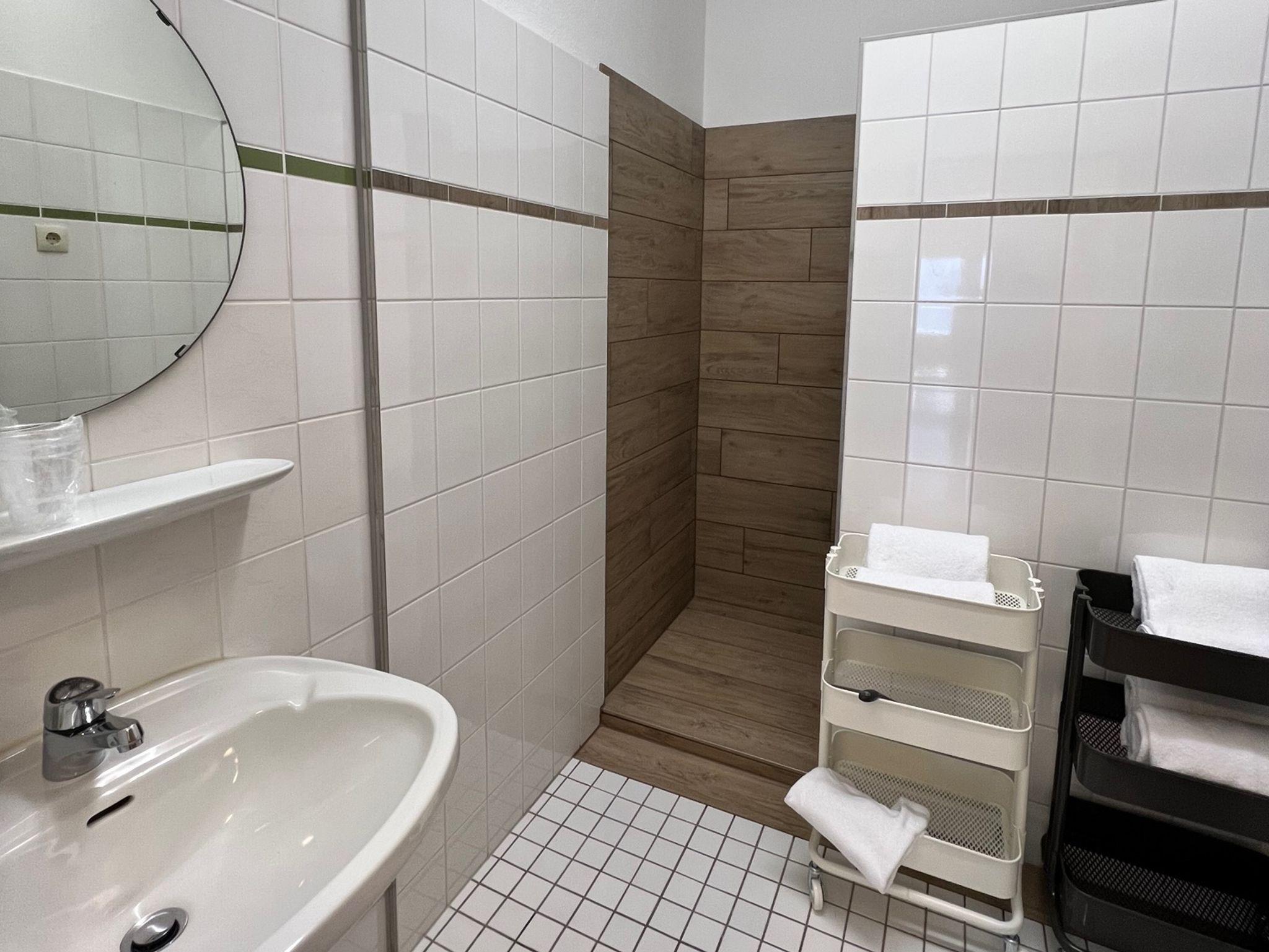 Das Badezimmer ist mit einer Dusche & Waschbecken ausgestattet. Zusätzlich stehen zwei separate WC-Räume mit Waschgelegenheit zur Verfügung.