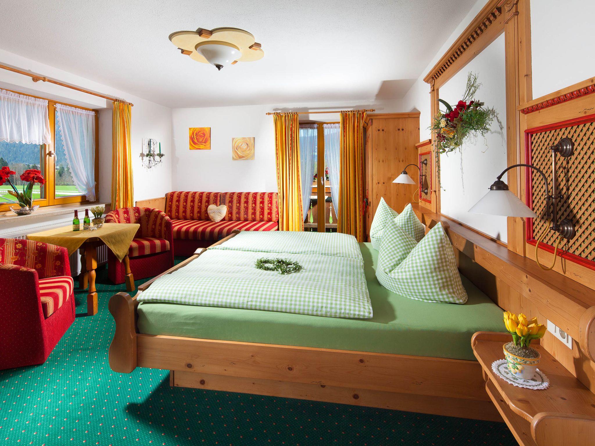 Dieses Nichtraucher-Zimmer liegt im Obergeschoß des Hauses und ist mit hellen Fichtenmöbeln ausgestattet. Es bietet ein Doppelbett, Sitzecke, TV mit Kabelanschluss und ein Bad mit Dusche/WC, Toilettenartikel und Fön. Auf dem Balkon mit Balkonmöbel haben Sie einen fantastischen Blick auf die gesamte Bergwelt.Auf Anfrage und Zuzahlung kann dieses Zimmer auch als Dreibettzimmer gebucht werden.