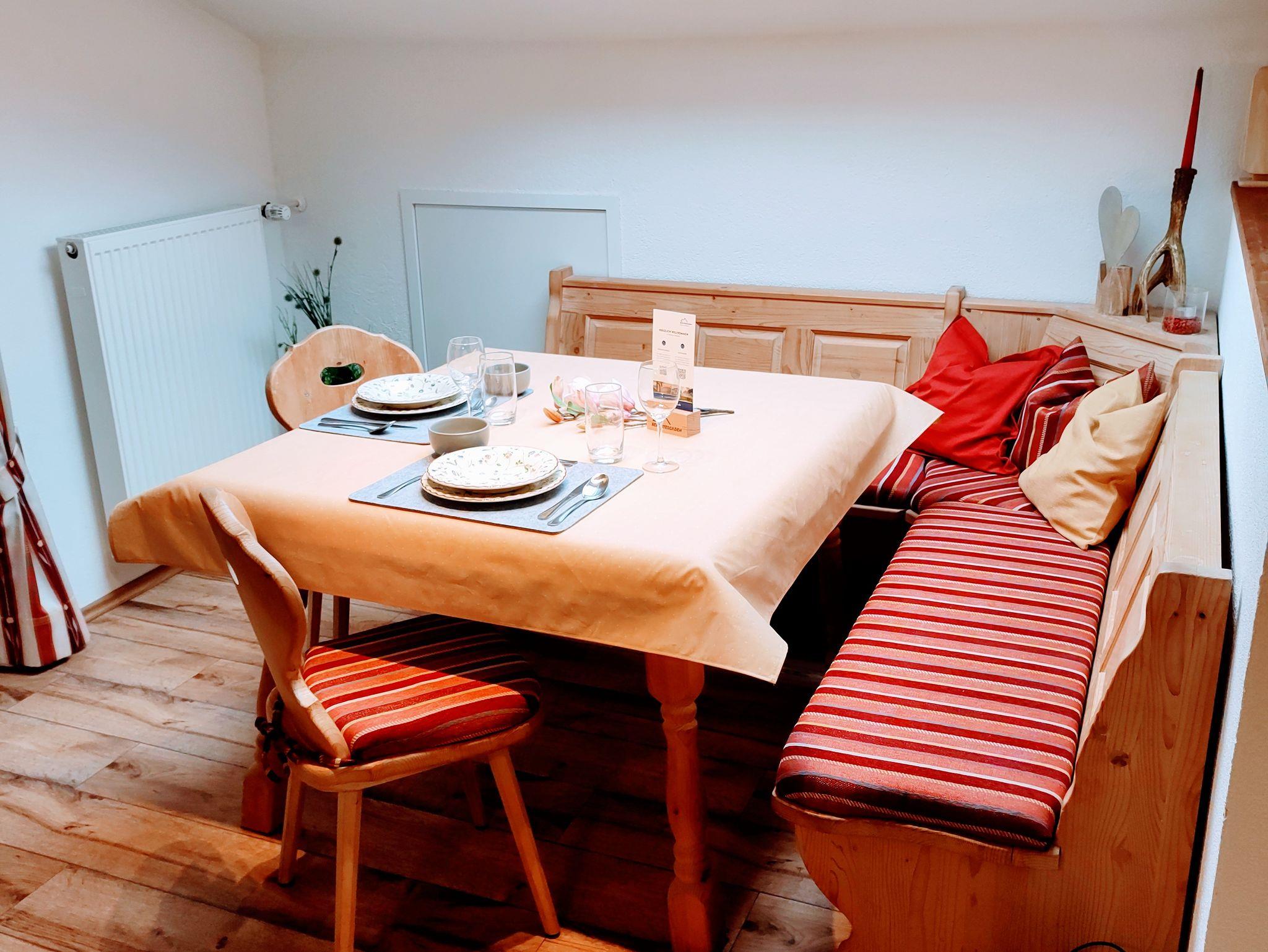 In der großzügigen Wohn-Ess-Küche befindet sich ein kuscheliges Ecksofa sowie eine rustikale Eckbank mit einem großen Dachfenster darüber.