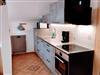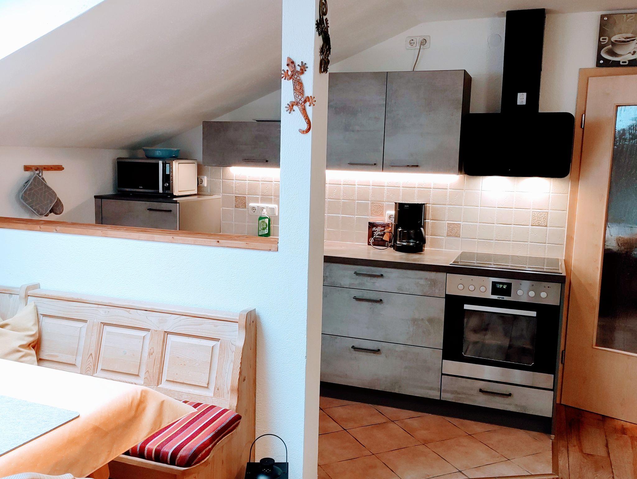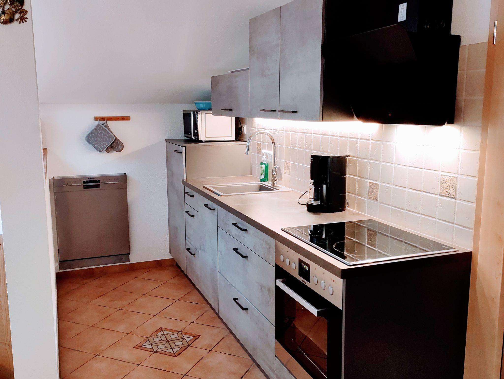Kühlschrank mit Gefrierfach, Cerankochfeld mit Dunstabzugshaube, Backofen, Spülmaschine, Kaffeemaschine, Mikrowelle, Wasserkocher, Toaster, Geschirr und Besteck, Kochgeschirr und Geschirrtüchern.
