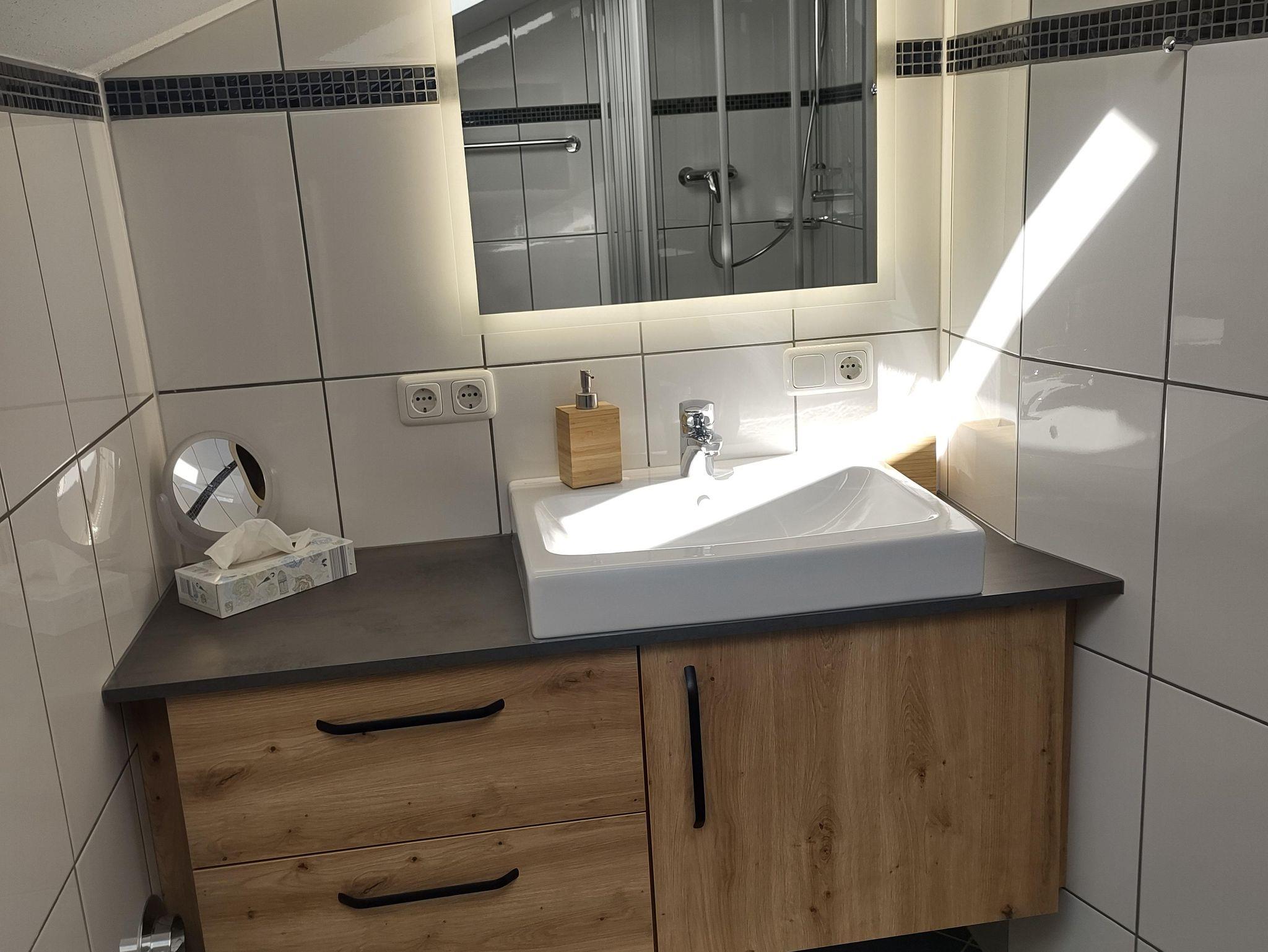 Das Moderne Bad ist mit einer Dusche, WC und Waschbecken ausgestattet. Handtücher liegen zu Ihrer Verfügung kostenfrei bereit.