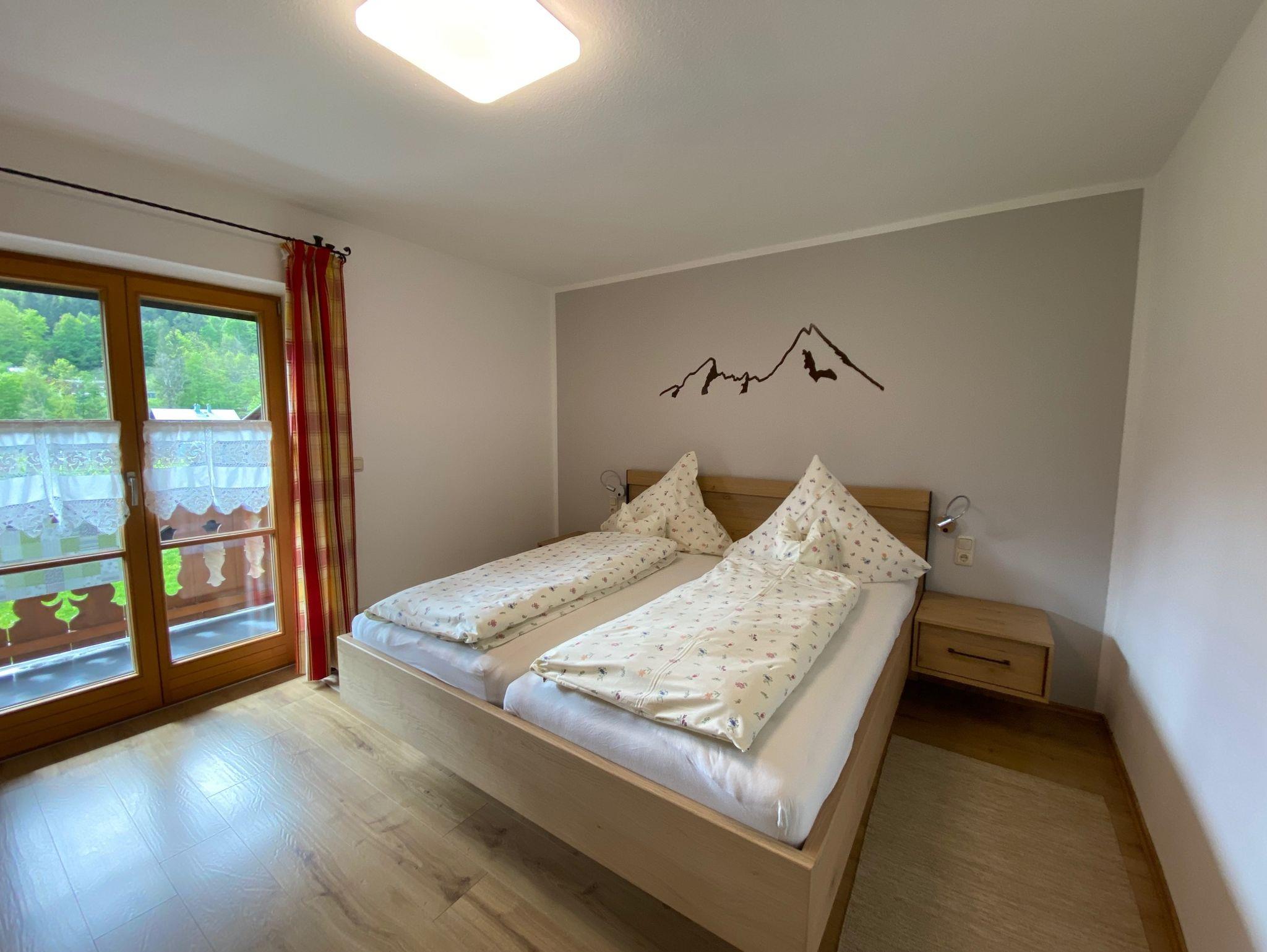 Diese Nichtraucher-Ferienwohnung bietet Platz auf 45 qm und befindet sich im oberen Stock des Hauses. Sie ist ausgestattet mit einem separaten Schlafzimmer und einem kleineren Zimmer mit Etagenbett, einer gemütlich eingerichteten Wohnküche mit Sitzecke, Essecke und sehr gut ausgestatteter Küchenzeile, sowie einem Bad mit Dusche und WC. Vom West-Balkon aus haben Sie einen grandiosen Watzmannblick.