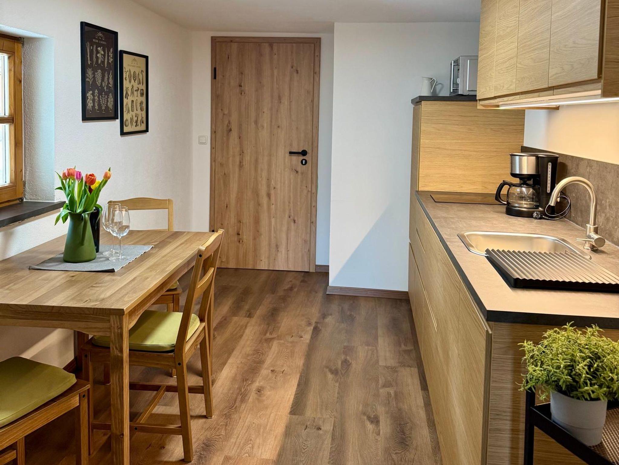 Die neu renovierte Ferienwohnung bietet Platz auf 40 qm und liegt im Obergeschoss des Hauses. Sie ist ausgestattet mit einem separaten Schlafzimmer, einer Küche mit Herd, Kühlschrank, Spülmaschiene, Kaffeemaschine, Toaster, Wasserkocher, Eierkocher und Essecke,einem Wohnzimmer mit Couch und TV. Im Bad mit Dusche/WC finden Sie Fön und Handtücher. Auf dem großen, möblierten Balkon können Sie die Ruhe genießen.