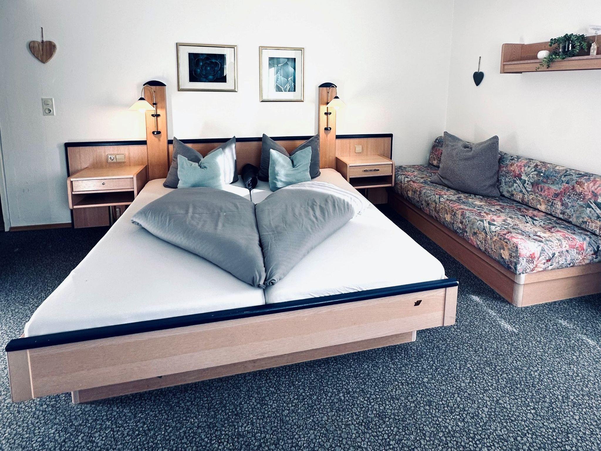 Es ist ausgestattet mit einem Doppelbett 180/200 und einem zusätzlichen Schlafsofa 90/200, einer kleinen Sitzgruppe, TV, WLAN und einem abschließbaren Nachtkästchen.