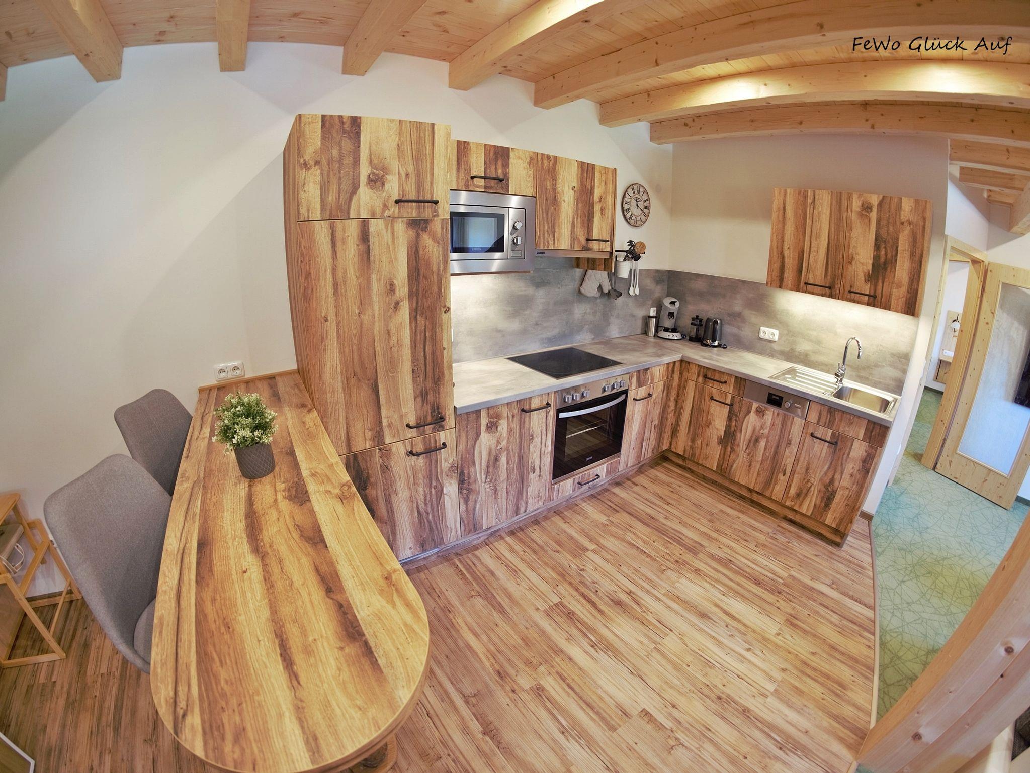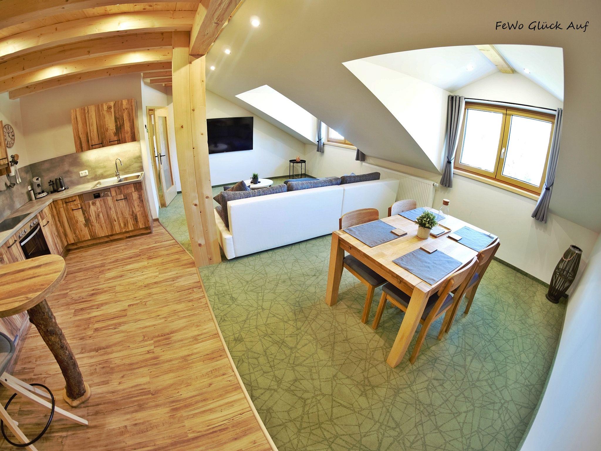 Die Ferienwohnung Glück Auf befindet sich im 2. Obergeschoß unseres Hauses und bietet Platz für 2-4 Personen. Unsere 2019 neu gebaute Ferienwohnung verfügt über ein Schlafzimmer, ein Badezimmer mit Dusche & WC sowie Radio und Föhn. Hausgang mit Kleiderschrank und Garderobe. Für einen gemütlichen Start in den Tag oder einen gemütlichen Abend, sorgt unsere offene Wohnküche, diese ist ausgestattet mit Kühlschrank inkl. Gefrierfach, Herd und Backofen, Kaffeemaschine-Padmaschine (Pad`s werden nicht gestellt), Toaster und Wasserkocher, eine Mikrowelle, sowie eine Bartheke mit 2 gemütlichen Barhockern. Die offen gestaltete Küche bietet Ihnen viel Platz zum Kochen im Beisein Ihrer Familie. Großer Esstisch mit 4 Sitzplätzen (Kinderstühle auf Anfrage). Eine große gemütliche Couch lässt Sie den Tag entspannt ausklingen. 2 Sat-TV (Schlafzimmer und Wohnbereich), WLAN in der gesamten Wohnung, gesamt 3 große Dachgauben mit Bergblick auf den Grünstein und unseren Hof. Brötchenservice (im Haus) gegen Aufpreis möglich. Babybett auf Anfrage. Handtücher und Bettwäsche werden bereitgestellt.