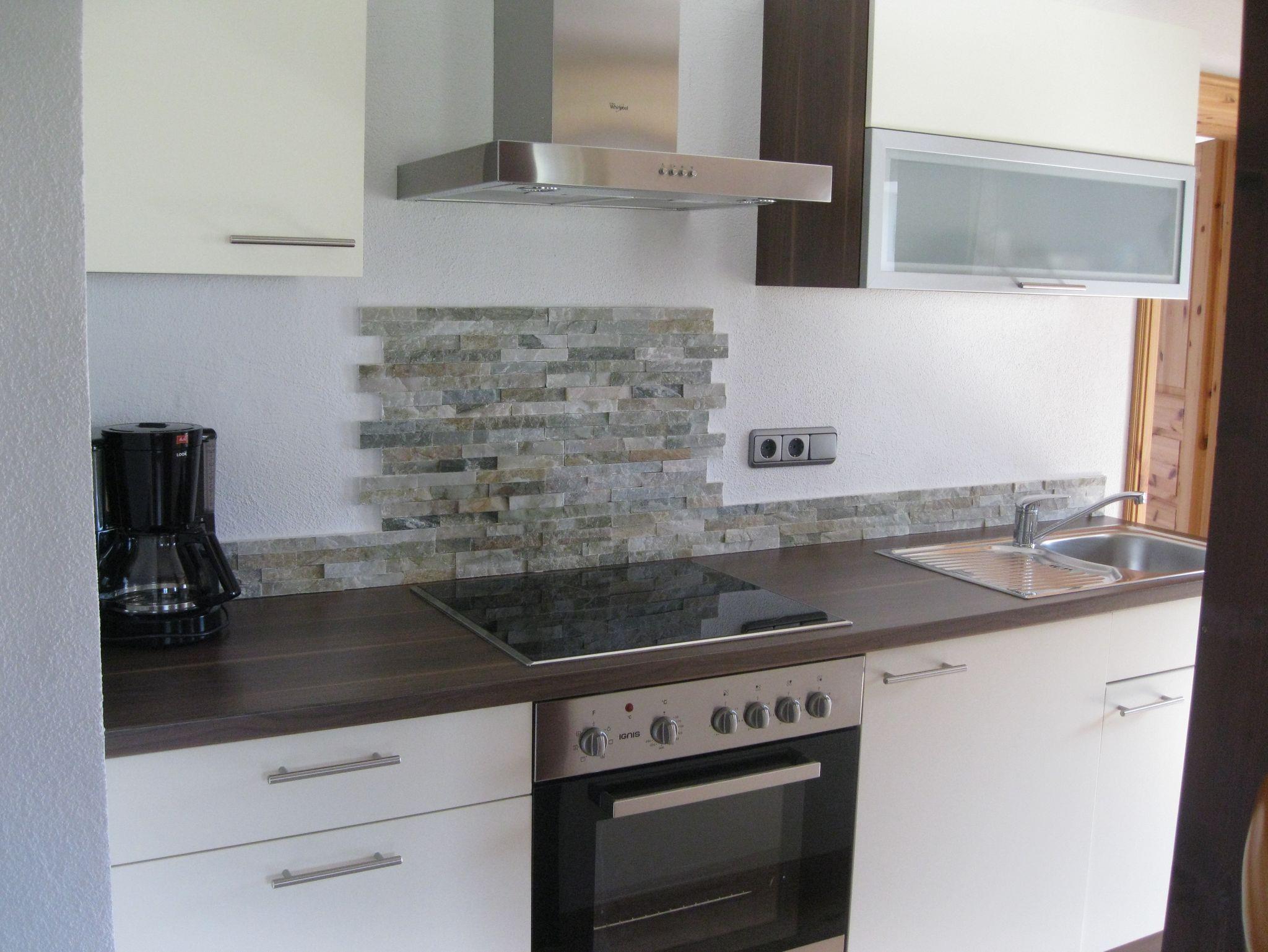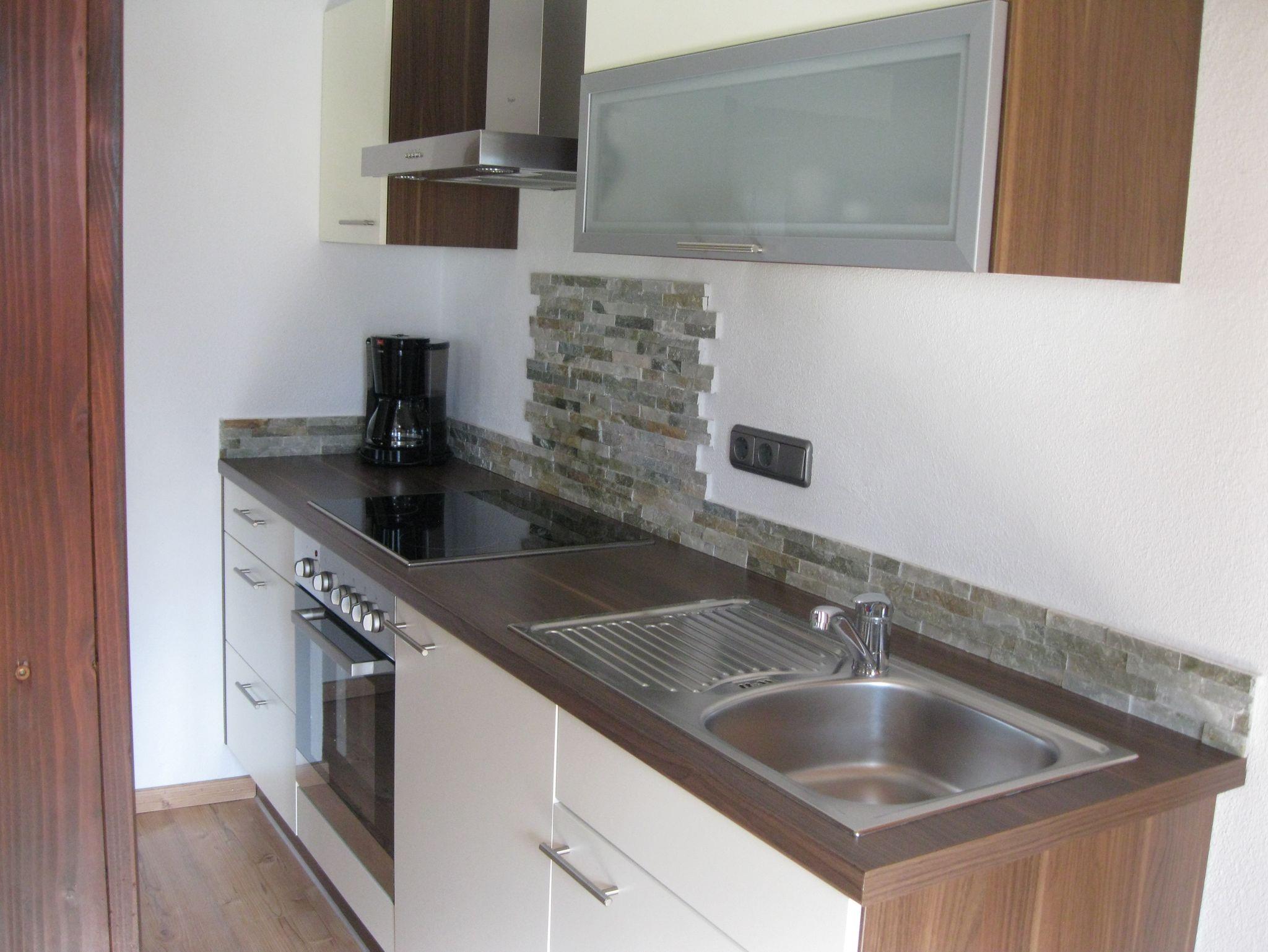 Der helle Wohnbereich mit integrierter Wohnküche bietet alles, was Sie für Ihren Aufenthalt benötigen: eine praktische Küchenzeile, ein gemütliches Sofa zum Entspannen sowie einen Flat-TV für unterhaltsame Abende.