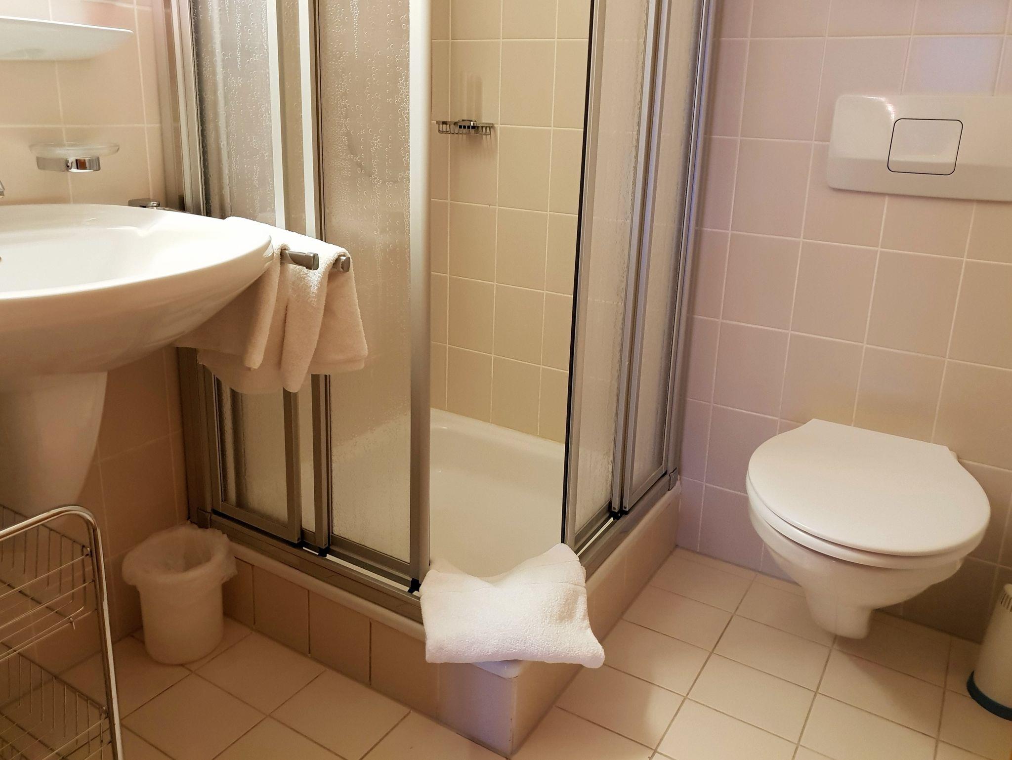 Das Badezimmer ist mit Dusche, Waschbecken und WC ausgestattet.