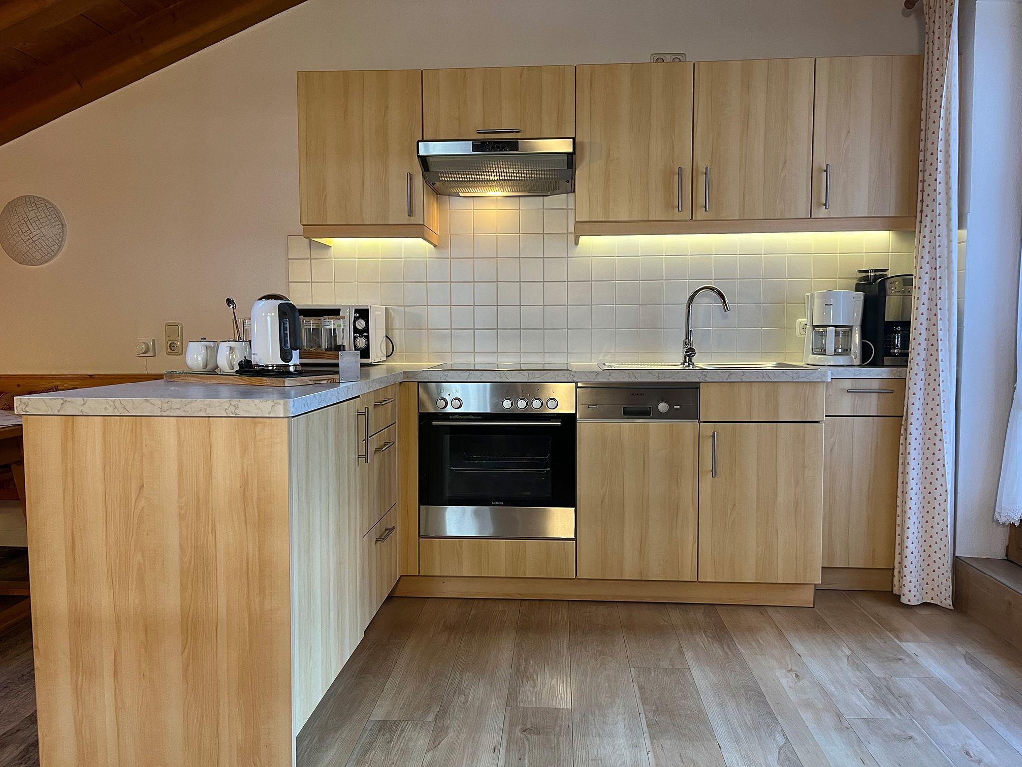 Unsere urgemütliche Ferienwohnung „Alpenrose“ hat ein großes Wohnzimmer mit Essecke und Schlafcouch und eine neue große Eck-Küchenzeile mit Geschirrspüler, 4-Platten-Ceranfeld und Backrohr, Kühlschrank mir Gefrierfach, Mikrowelle, Wasser- und Eierkocher, Toaster, Kaffeemaschine, Bio-Teestation, Flachbildschirm 107 cm, CD-Player, 1 separates Schlafzimmer mit Bandscheibenmatratzen und Bettwäsche, 1 neues Bad mit ebenerdiger Dusche und WC, Handtücher, Fön, Seifen- und Duschgelspender, Kosmetiktücher und Toilettenpapier, Flur, 2 große Balkone mit Blick auf die Berge.