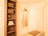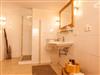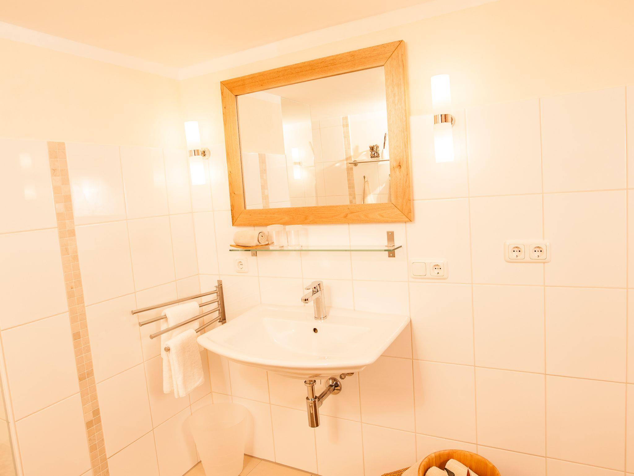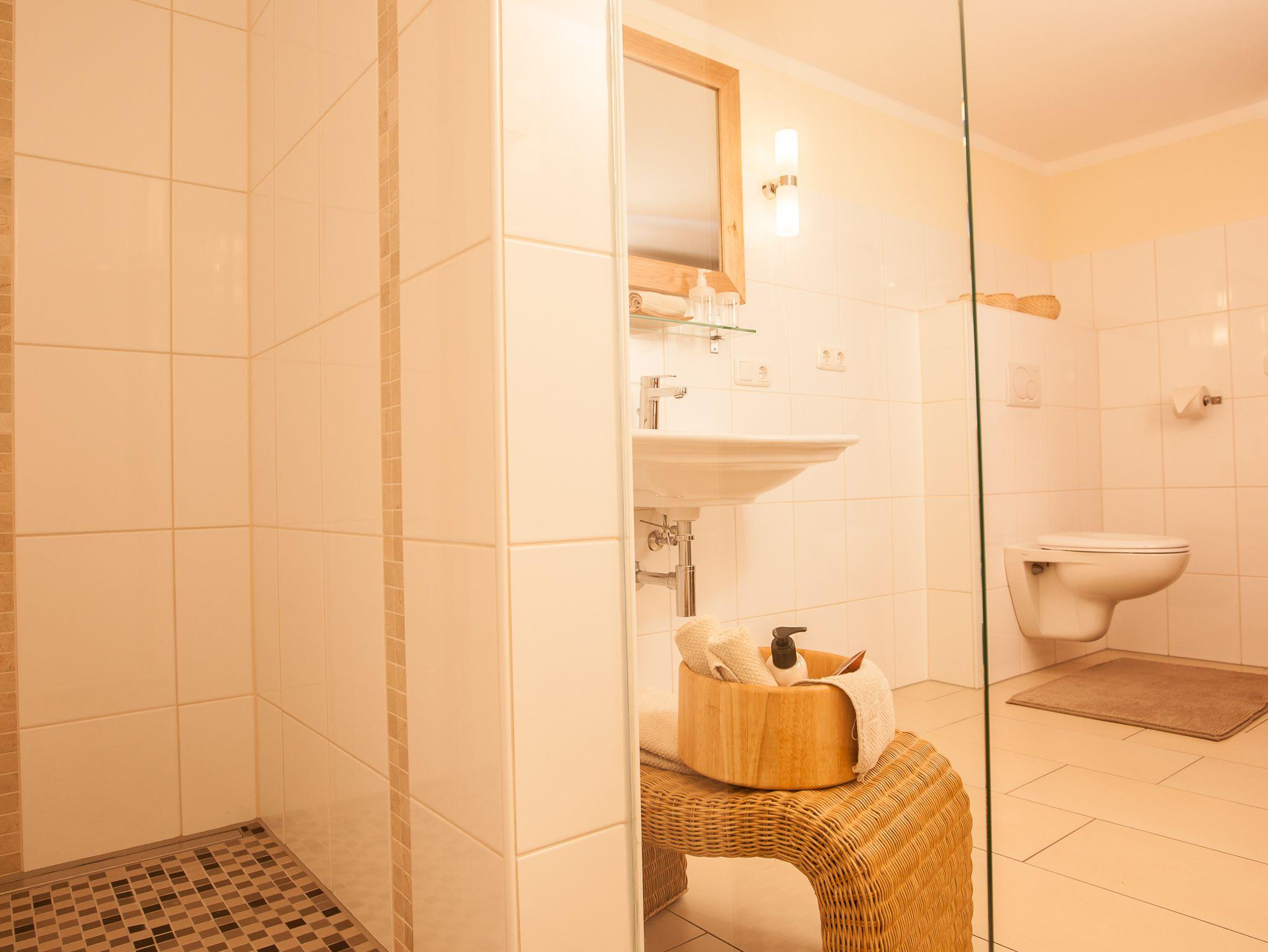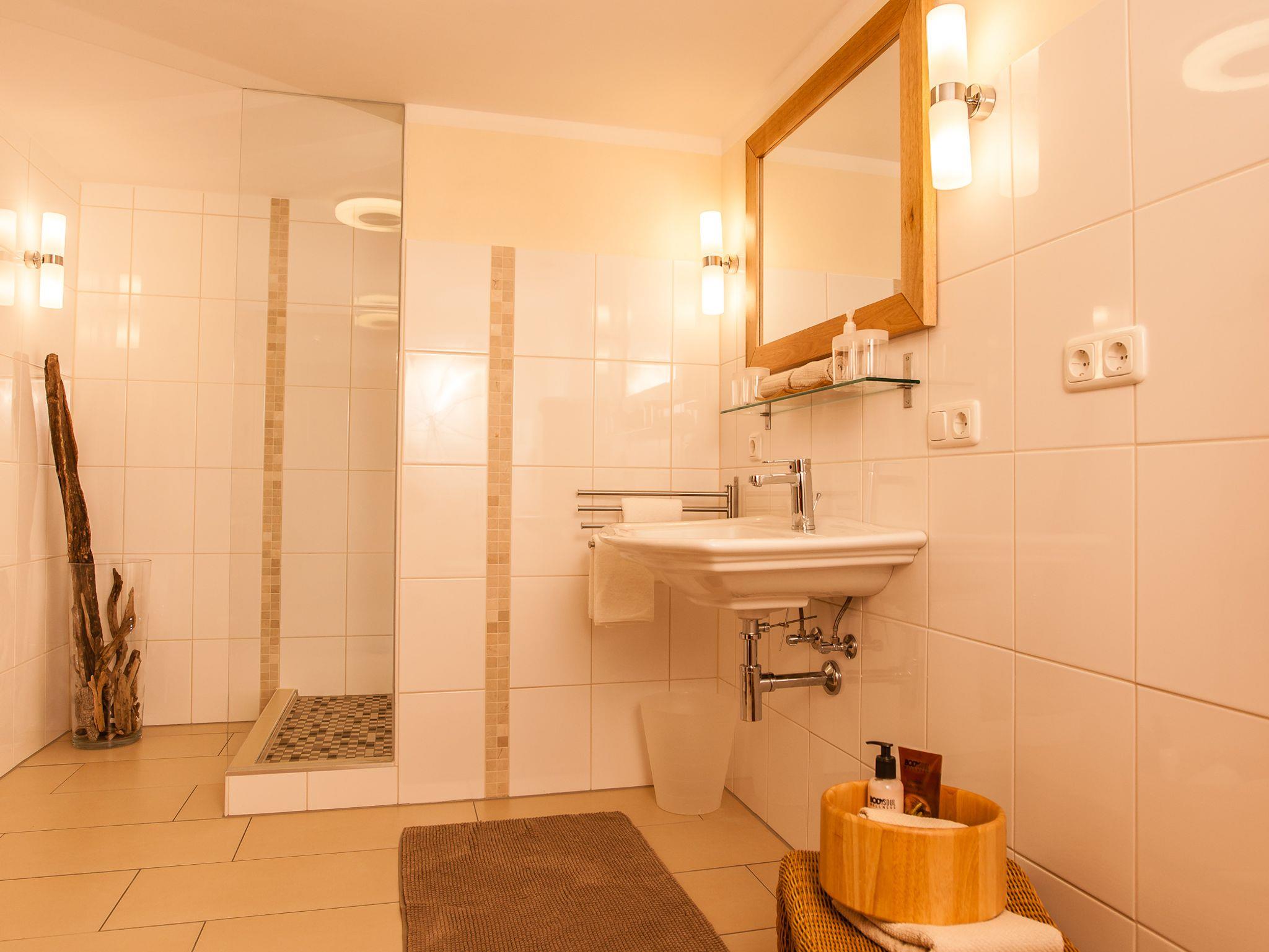 Großzügiges Bad mit offener Dusche, Kosmetiktisch, Holzhocker, 2 Bademäntel, Handtücher, Duschtücher, Gästehandtücher, Seife, Fön.