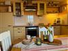 Küche – Vollausstattung. Esstisch mit Küchenbank, Küchenzeile, rundes Spülbecken mit Marmoreinfassung, Küchenutensilien, Kaffeemaschine, Espressomaschine, Teeauswahl, Wasserkocher, Taster, Eierkocher, Brotzeitbrett, Kühl– Gefrierkombination... es ist alles da!
