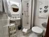 Das Badezimmer ist mit Dusche, Waschbecken und WC ausgestattet.