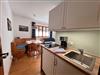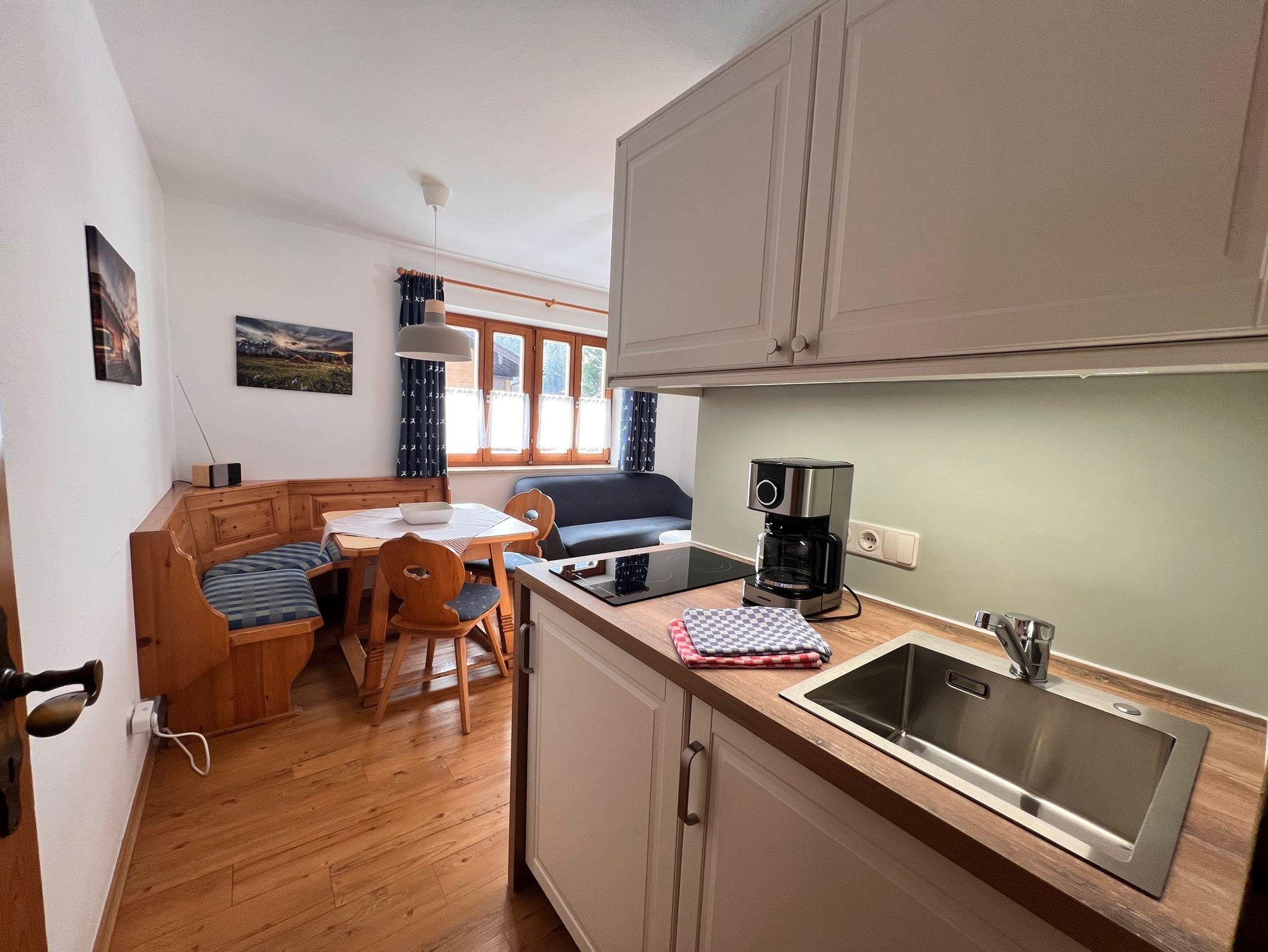 Die moderne Küchenzeile ist mit einem 2-Platten-Kochfeld, Kühlschrank mit Gefrierfach, Spülbecken sowie allen notwendigen Kochutensilien ausgestattet.