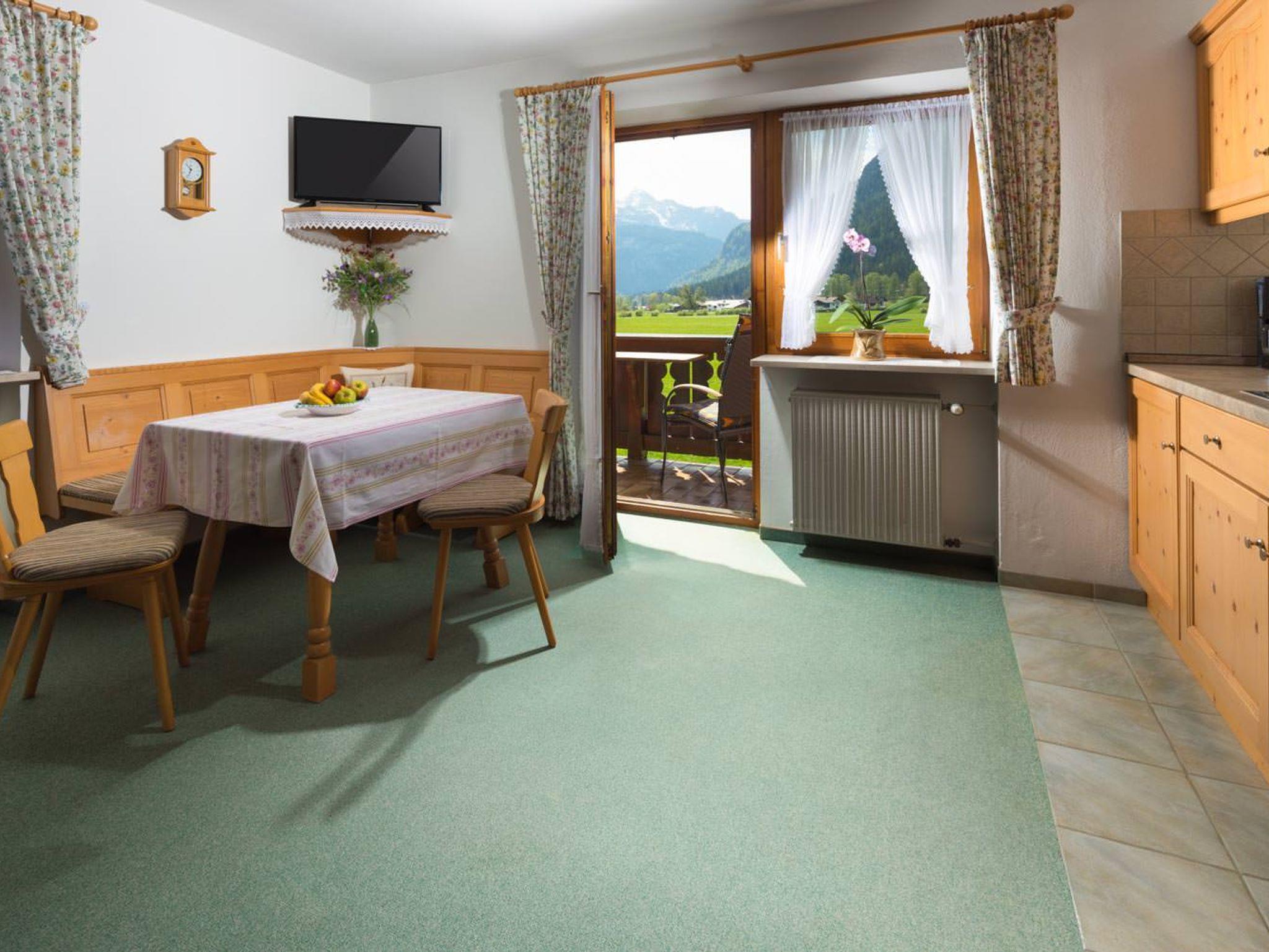 Die Ferienwohnung Kehlstein befindet sich im 1. Stock im Nebenhaus (Löslerstraße 31 a). Sie hat eine Wohnfläche von 40 qm und ist für bis zu 2 Personen geeignet. Der große Balkon (Ost-, Südseite) mit traumhaftem Blick auf die Berchtesgadener Berge, lädt zu einem gemütlichen Frühstück ein. In der Wohnküche mit Küchenzeile (Zweiplattenherd) befindet sich eine Couch, Essecke und TV. Das geräumige Schlafzimmer bietet ein Doppelbett und einen Einbauschrank. Das Bad ist mit Dusche und WC ausgestattet.