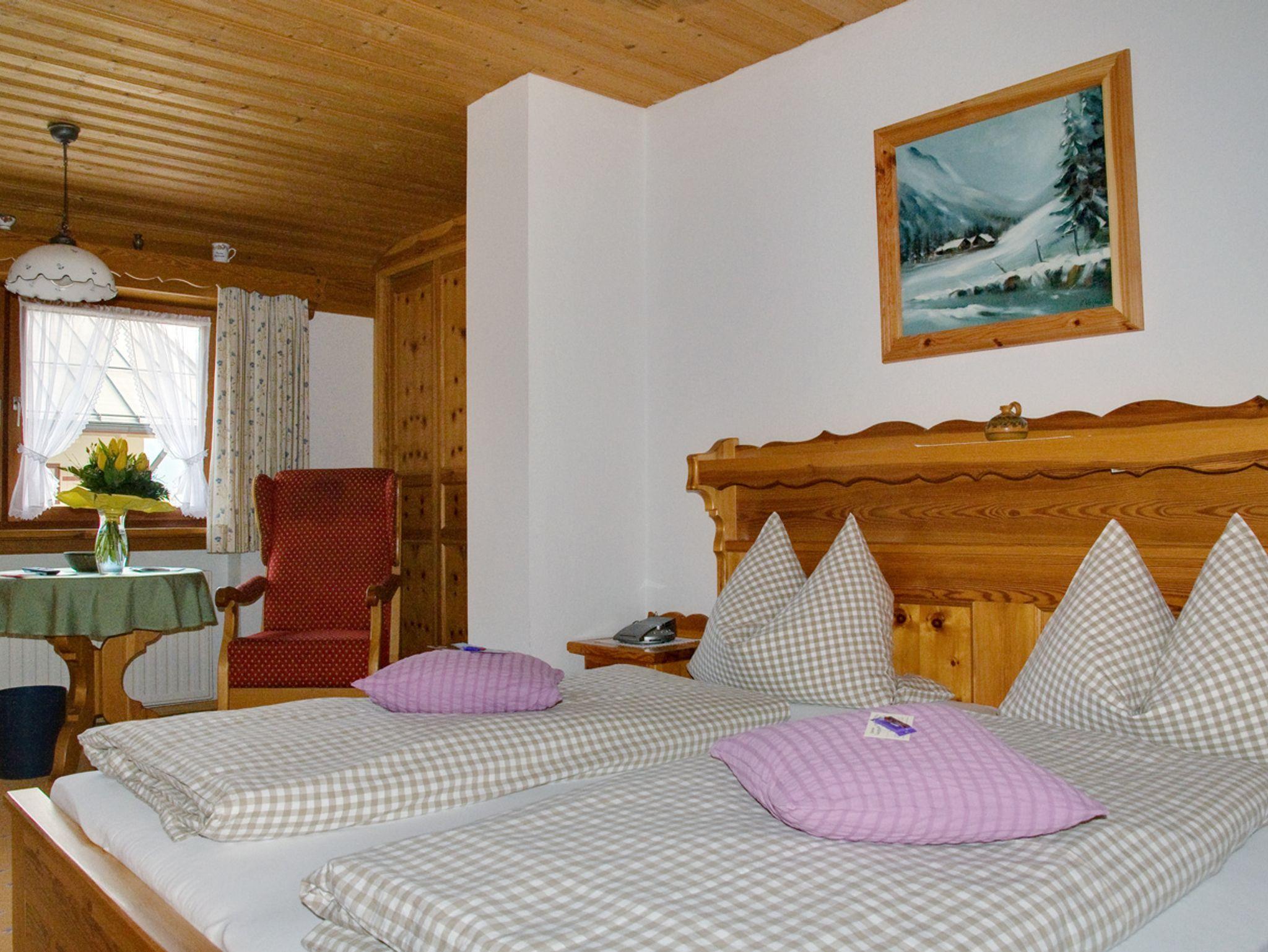 Gemütlich eingerichetes Nichtraucher-Doppelzimmer ca. 30 qm groß im Obergeschoß ausgestattet mit Dusche/WC, Fön, Toilettenartikel, Flachbildfernseher mit Kabel TV, WLAN, einem Tisch und 2 gemütlichen Fernsehsesseln. Auf dem möblierten Balkon haben sie einen wunderbaren Ausblick auf die Berge.