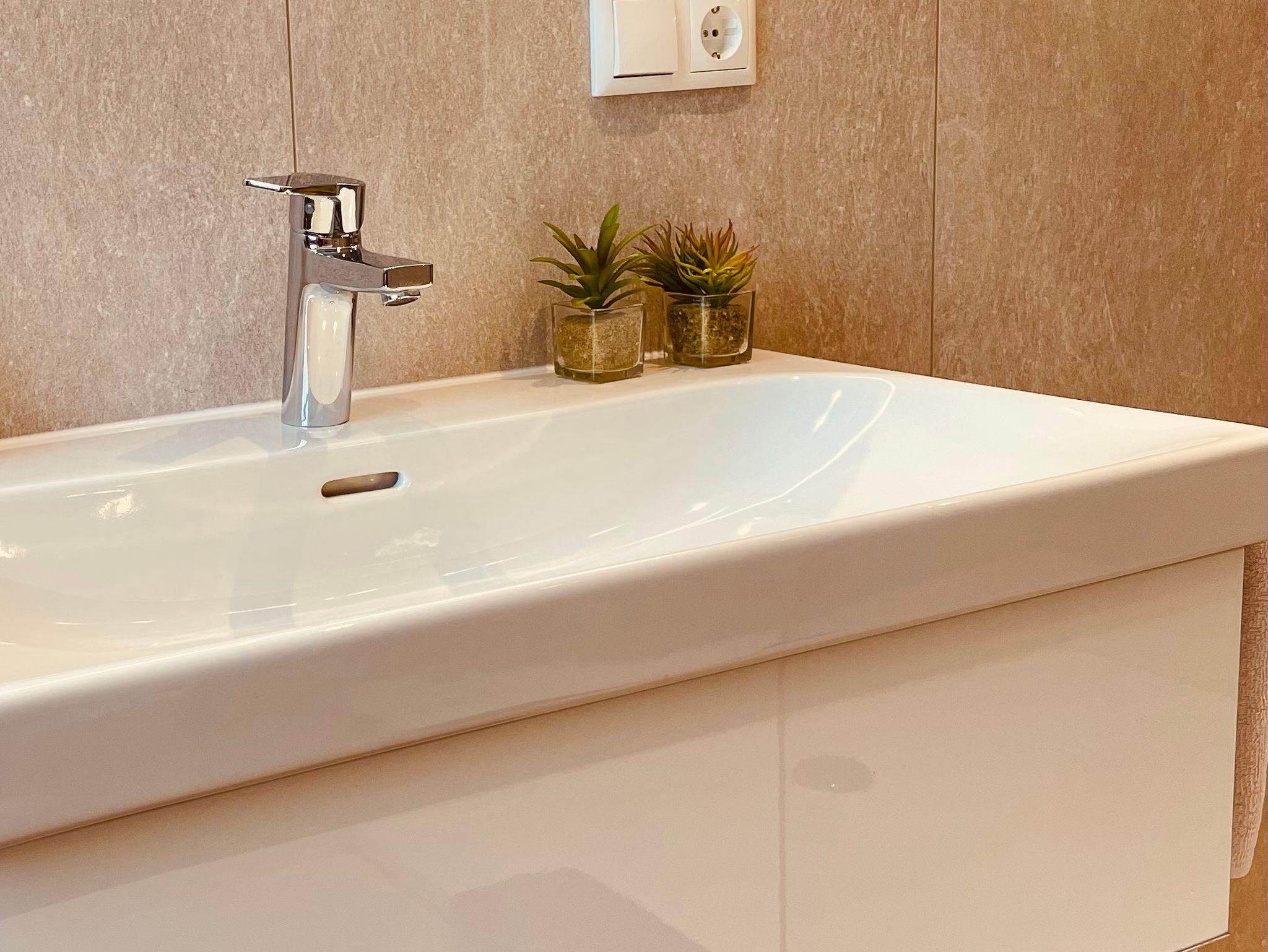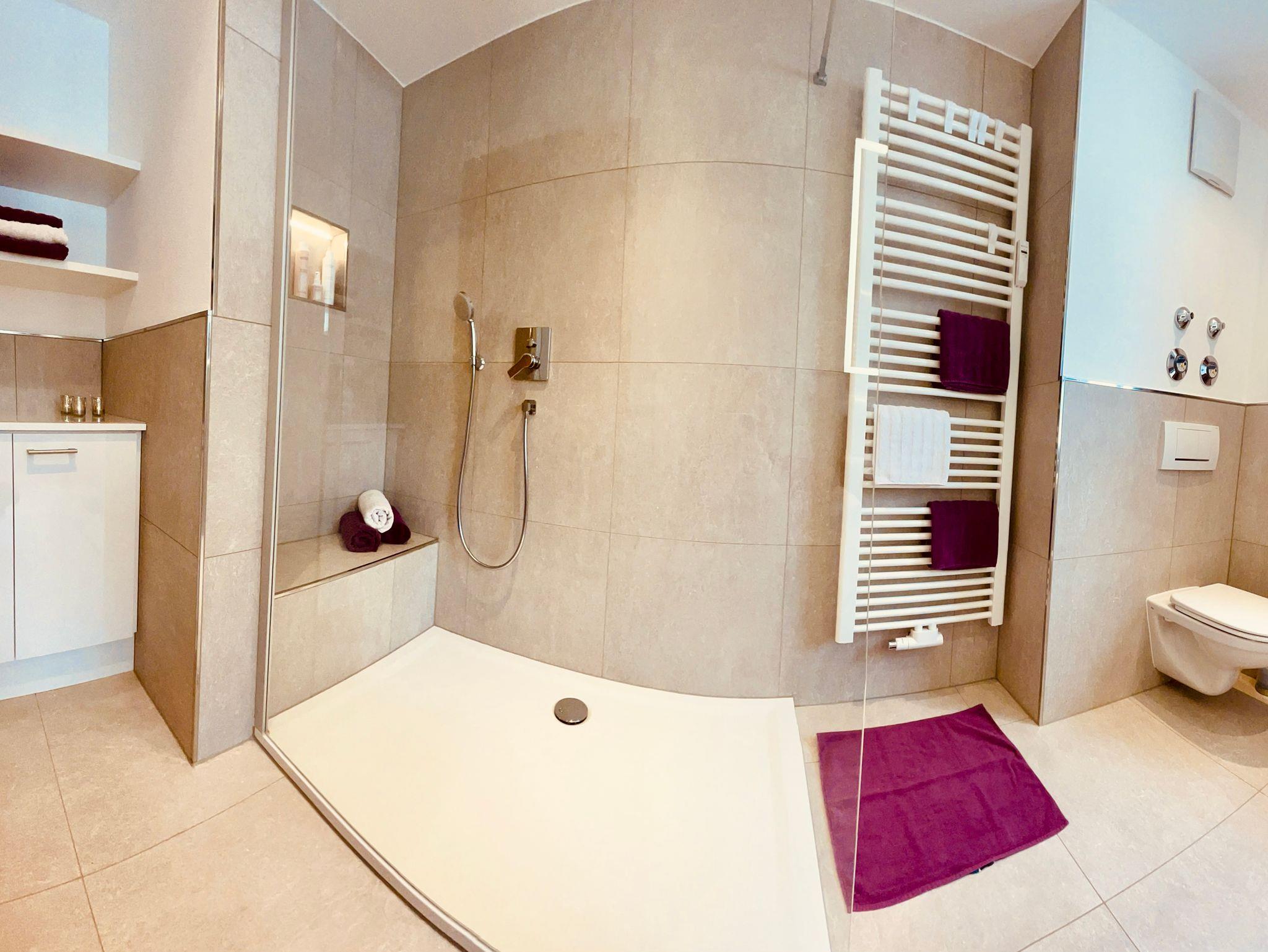 In der Ferienwohnung befinden sich insgesamt drei Schlafzimmer, davon sind zwei jeweils mit einem 1,80m großen Doppelbett ausgestattet und eines mit einem 1,40m breiten Bett. Neben dem 2021 komplett neu sanierten Bad mit begehbarer Walk-In-Rainshower-Dusche und WC ist noch ein separates WC vorhanden.