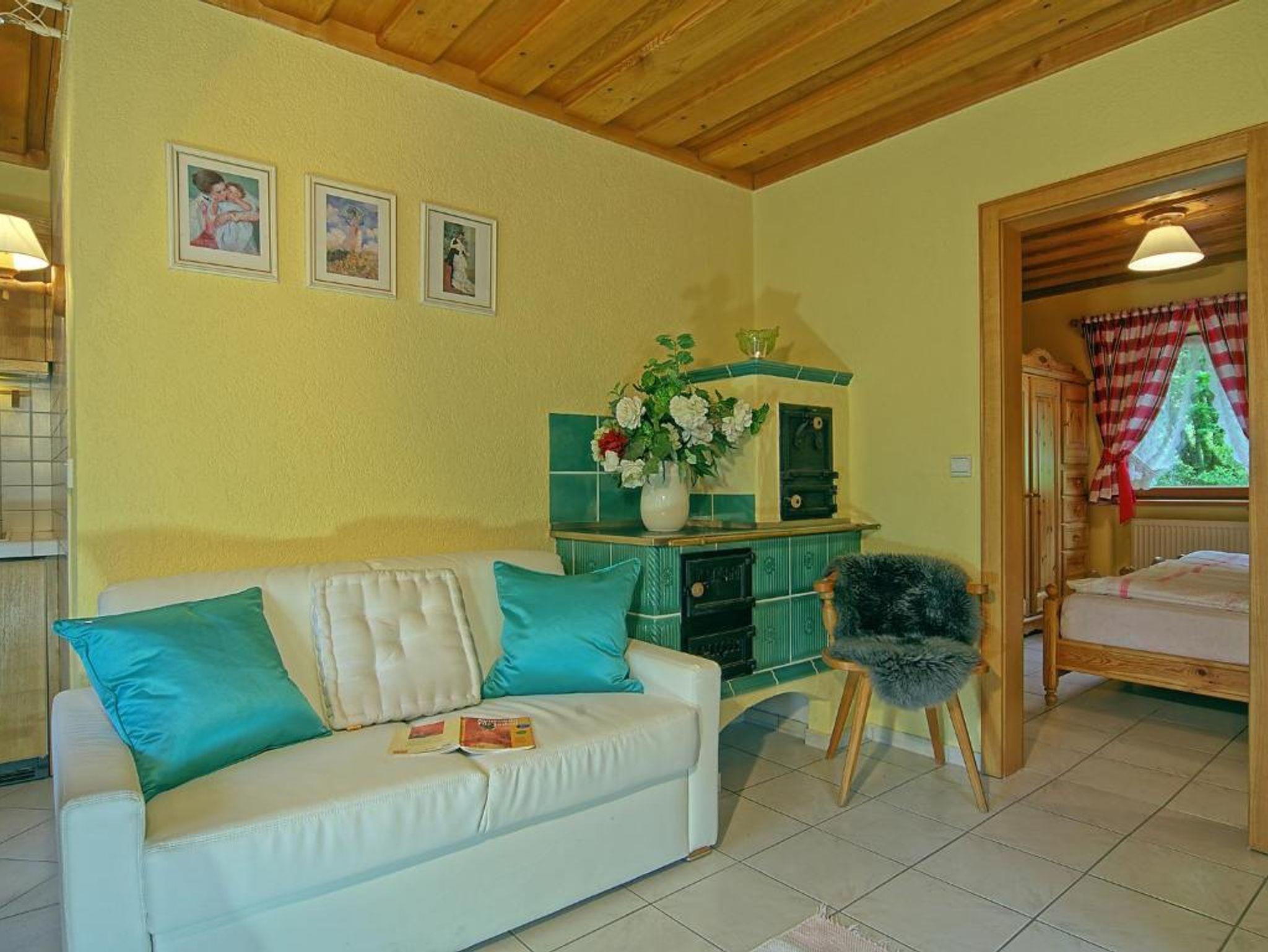 Die gemütliche Ferienwohnung bietet Platz auf 35 qm. Sie ist ausgestattet mit einer handgefertigten Eschenholzausstattung in der Wohnküche, mit 2 Cerankochfelder, Dunstabzug, Kühlschrank, Spülmaschine, Mikrowelle, Kaffeemaschine, Nespresso-Maschine mit Kapseln, Wasserkocher und Toaster. Im Wohnbereich exklusive Vorhänge, schöne Leuchten, „echter“ Kachelofen, Loewe- Flachbild-Fernseher! Schlafzimmer mit Vollholzmöbel, exklusive Stoffe aus Naturmaterialen wie Loden und Seide. Durchgehend Fliesenboden mit Fußbodenheizung, waschbaren Teppichen. Dusche und WC separat, mit farblich abgestimmten Vorleger und hochwertigen Handtücher. Auf der Terrasse mit Gartenmöbel haben Sie einen herrlichen Blick auf die Bergwelt.