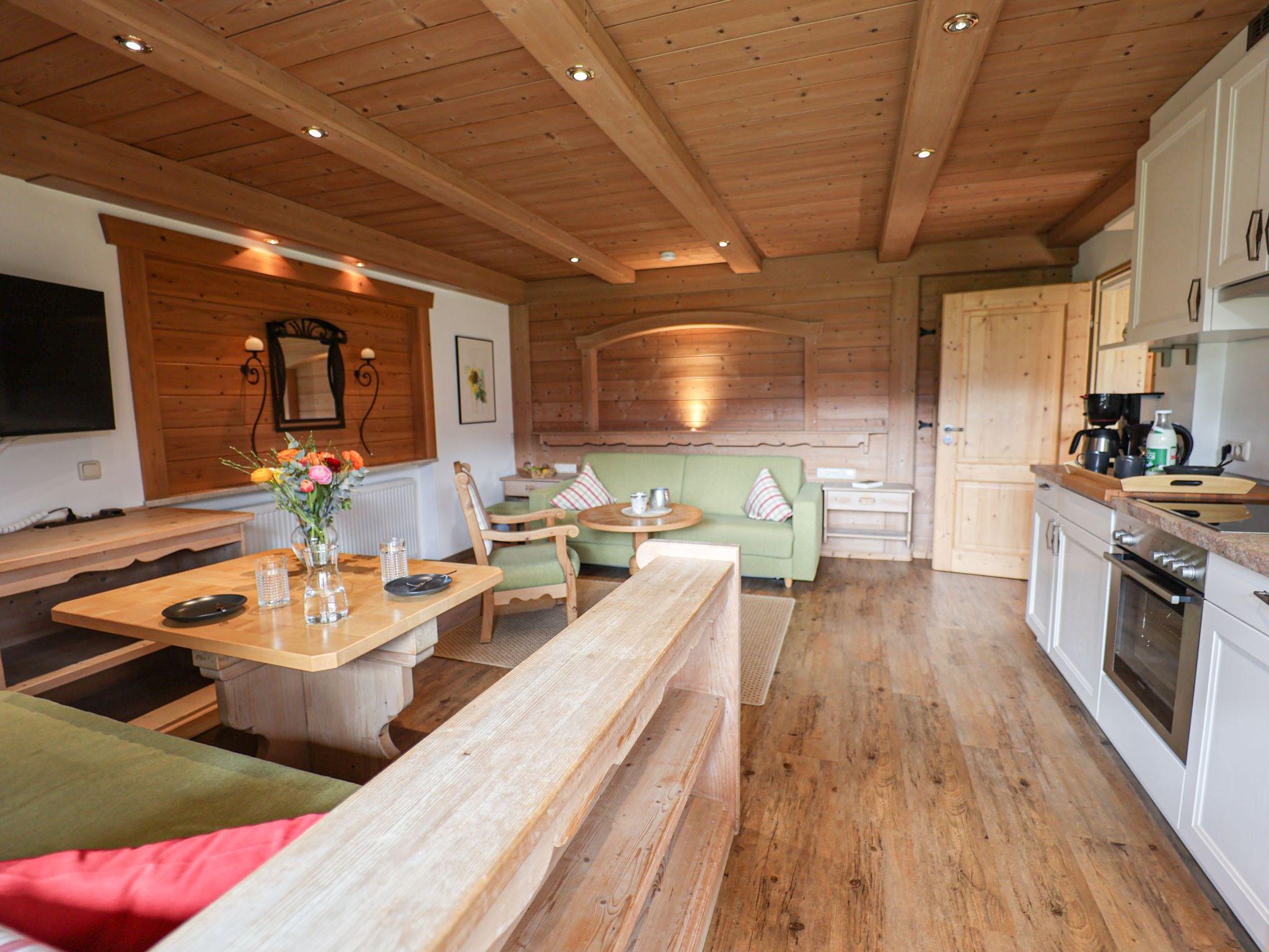 Die Wohnung ist vom Deutschen Tourismusverband (DTV) mit F**** ausgezeichnet!Die mit viel naturbelassenem Holz eingerichtete Wohnung teilt sich auf in einen Eingangsraum; ein separates Schlafzimmer; ein Bad mit Dusche und WC, Waschtisch; einen geräumigen Wohnraum mit Essecke, einer ausziehbaren Couch mit einem Schlafkomfort wie ein Bett und eine Küchenzeile.Die Ferienwohnung Nr. 1 befindet sich im 1. Stock und besitzt einen Süd- und Ost-Balkon mit zauberhaften Blick auf die Berchtesgadener Alpen.
