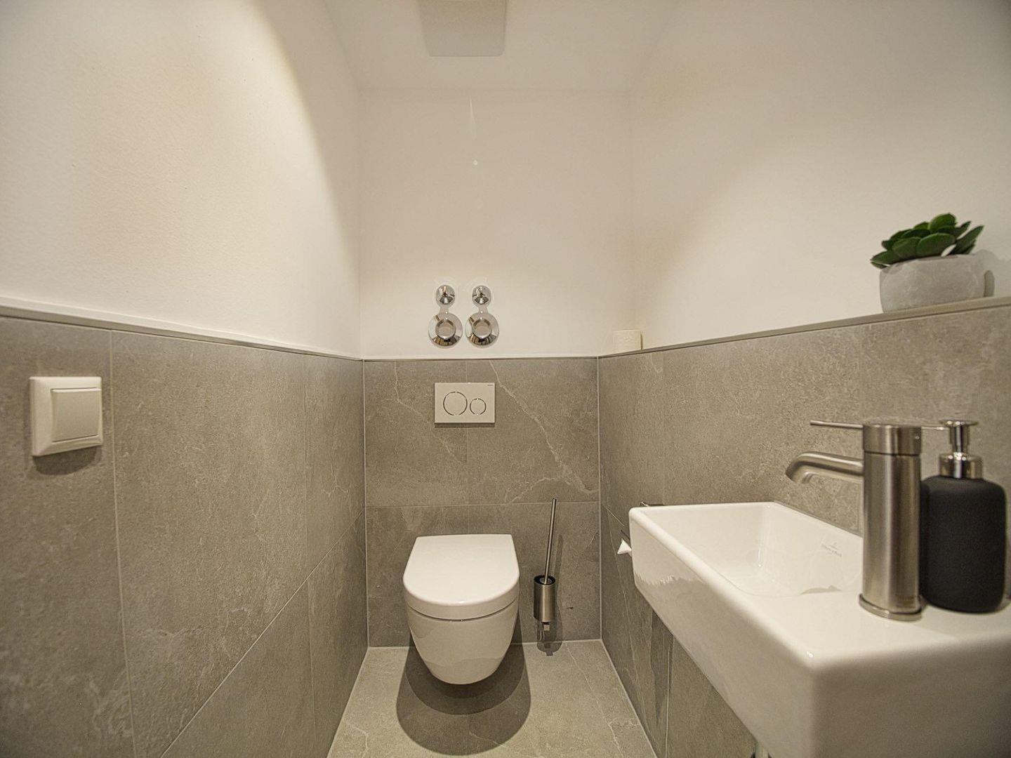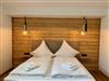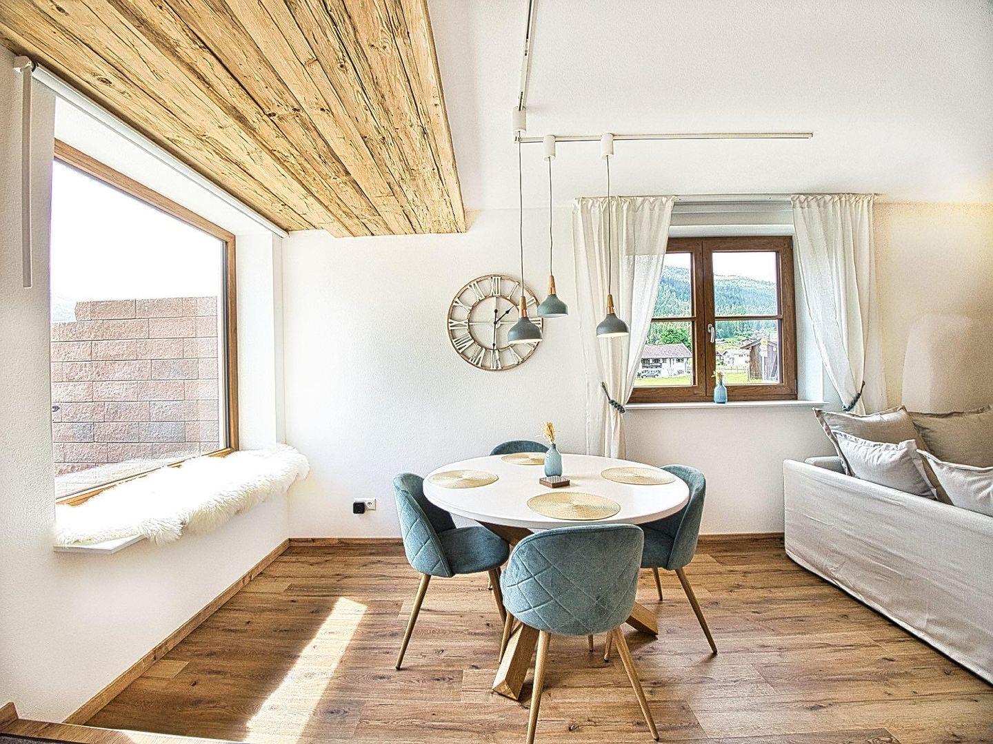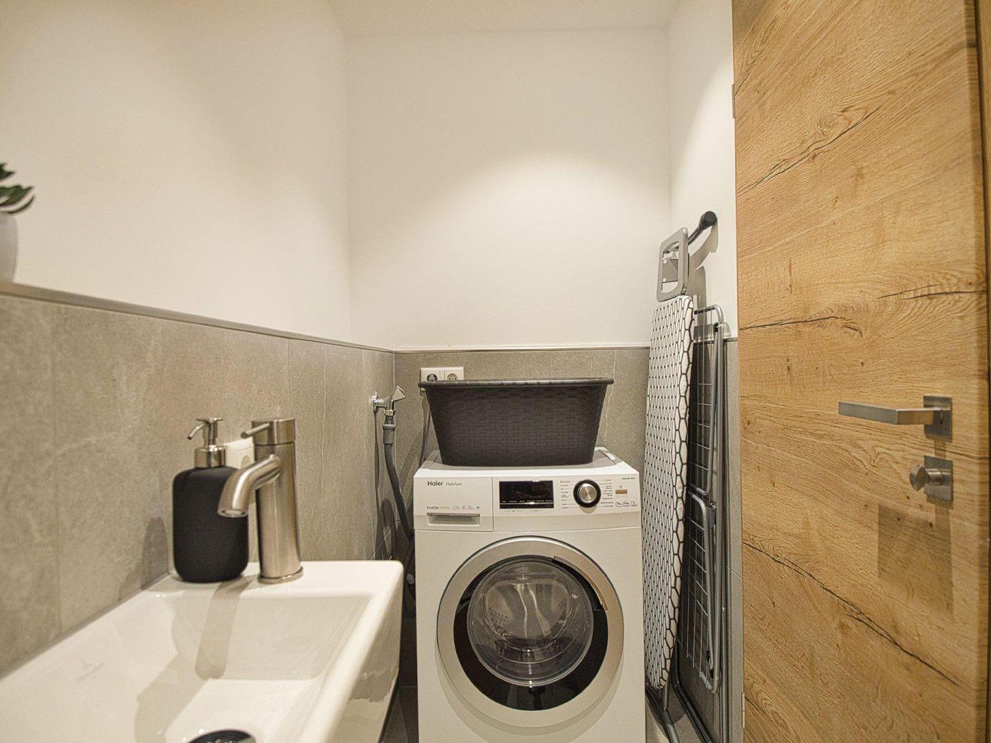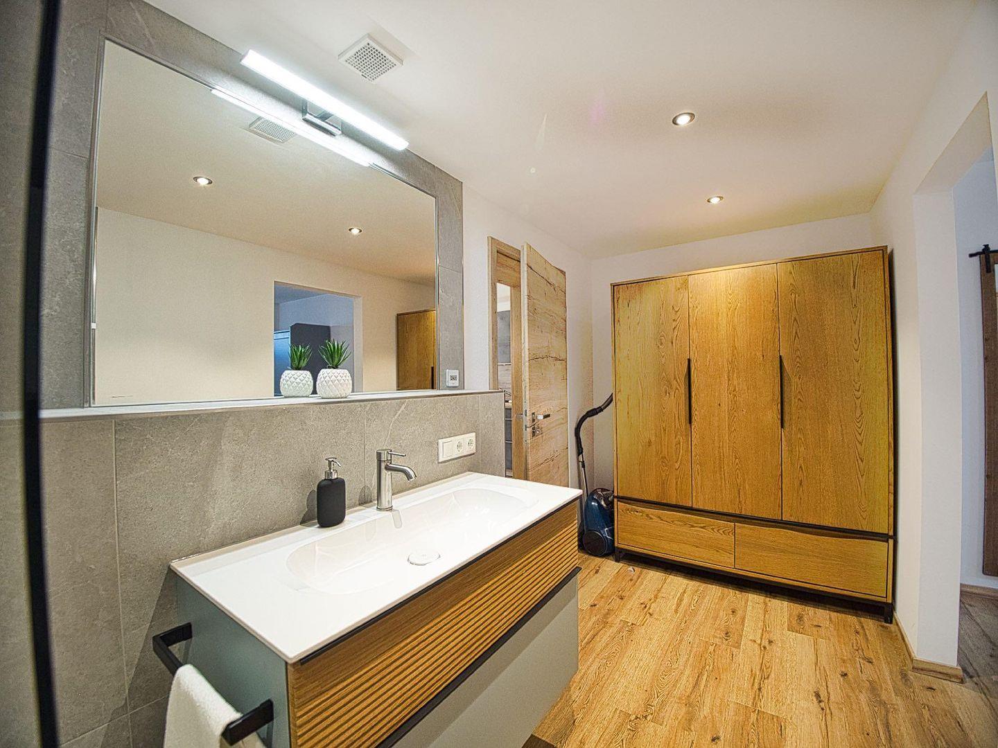 Im Schlafzimmer sorgt ein komfortables Boxspringbett für erholsamen Schlaf. Das offen gestaltete Badezimmer mit bodengleicher Dusche schließt direkt an, ein separates WC mit Waschmaschine bietet zusätzlichen Komfort – auch für längere Aufenthalte oder Workation in den Alpen. Schnelles Internet ist selbstverständlich vorhanden.