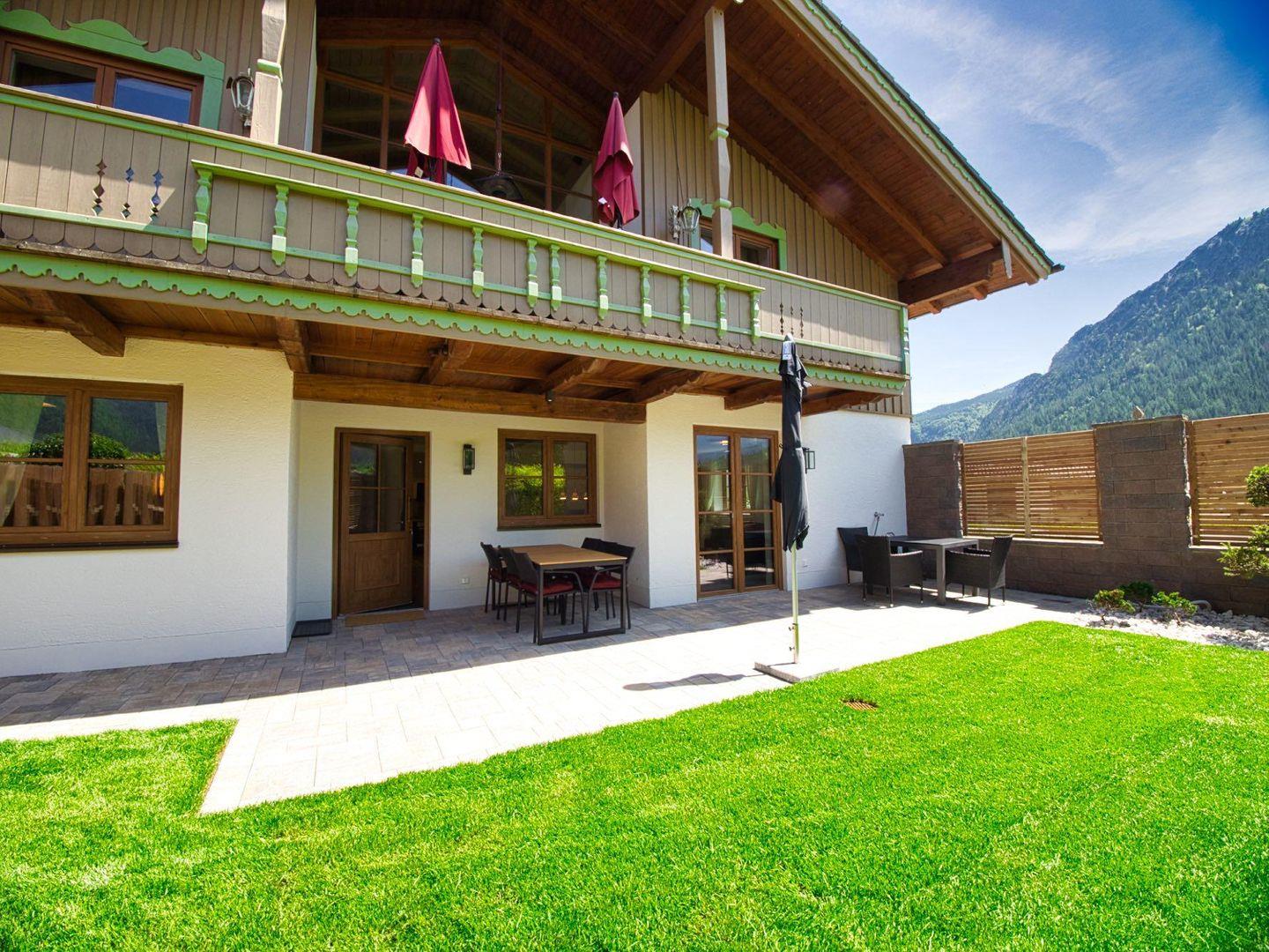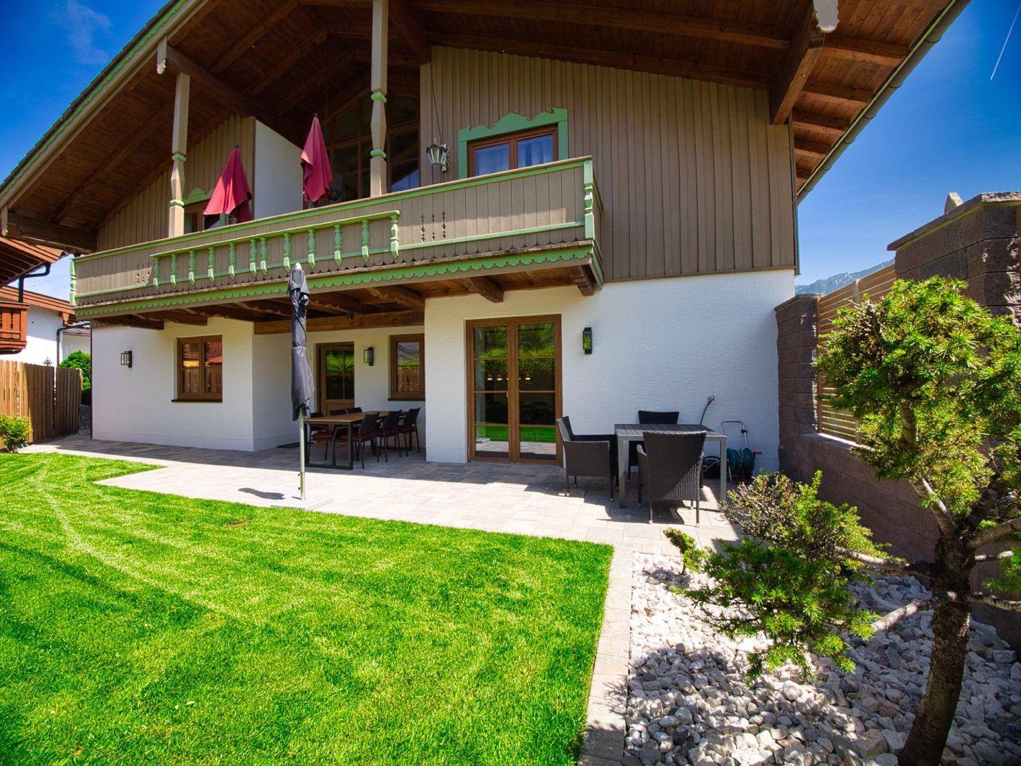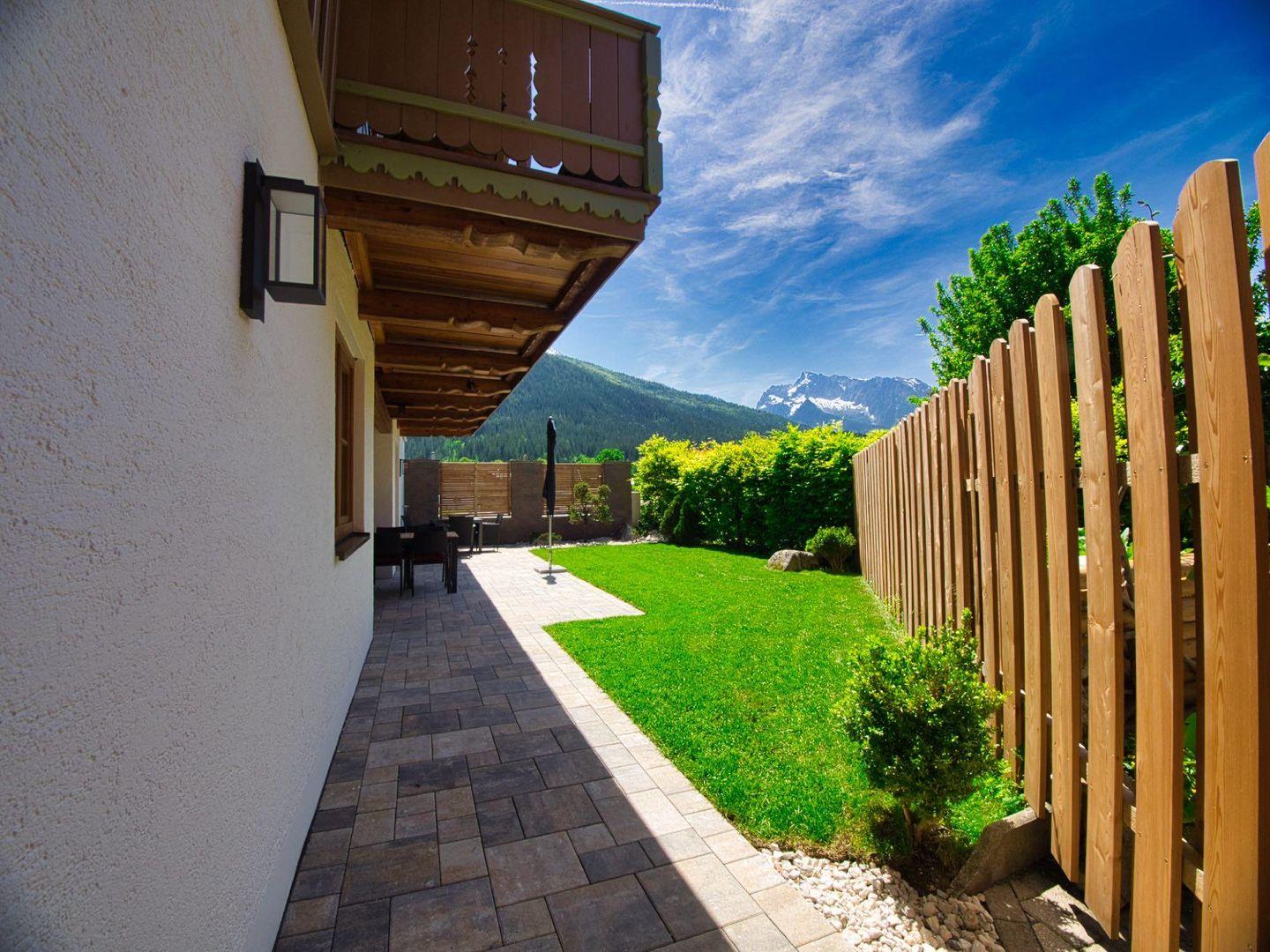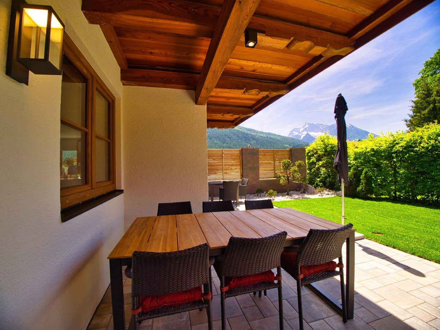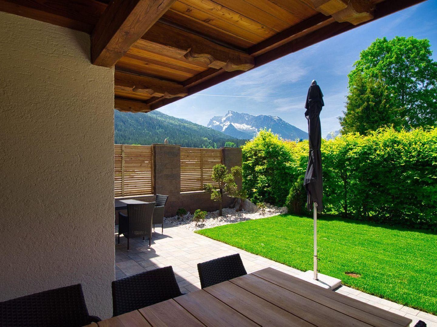 Ein echtes Plus ist die großzügige Terrasse mit Garten. Hier können Kinder frei spielen, während Erwachsene entspannen oder gemeinsam essen. Der Blick ins Grüne und auf die umliegende Bergwelt – mit Blick zum Hochkalter – unterstreicht den naturnahen Charakter der Wohnung.