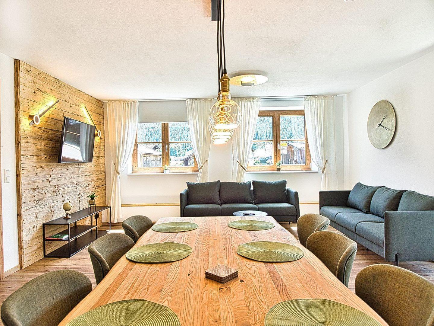 Der offene Wohn- und Essbereich ist das Herzstück der Wohnung. Hochwertige Materialien, viel Holz und bequeme Sofas schaffen einen Raum, in dem man gern zusammenkommt – sei es beim gemeinsamen Kochen, bei Spieleabenden oder nach einem erlebnisreichen Tag in den Bergen. Die offene Küche ist vollständig ausgestattet und ideal für den Familienalltag im Urlaub.