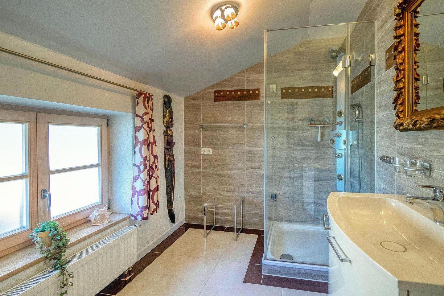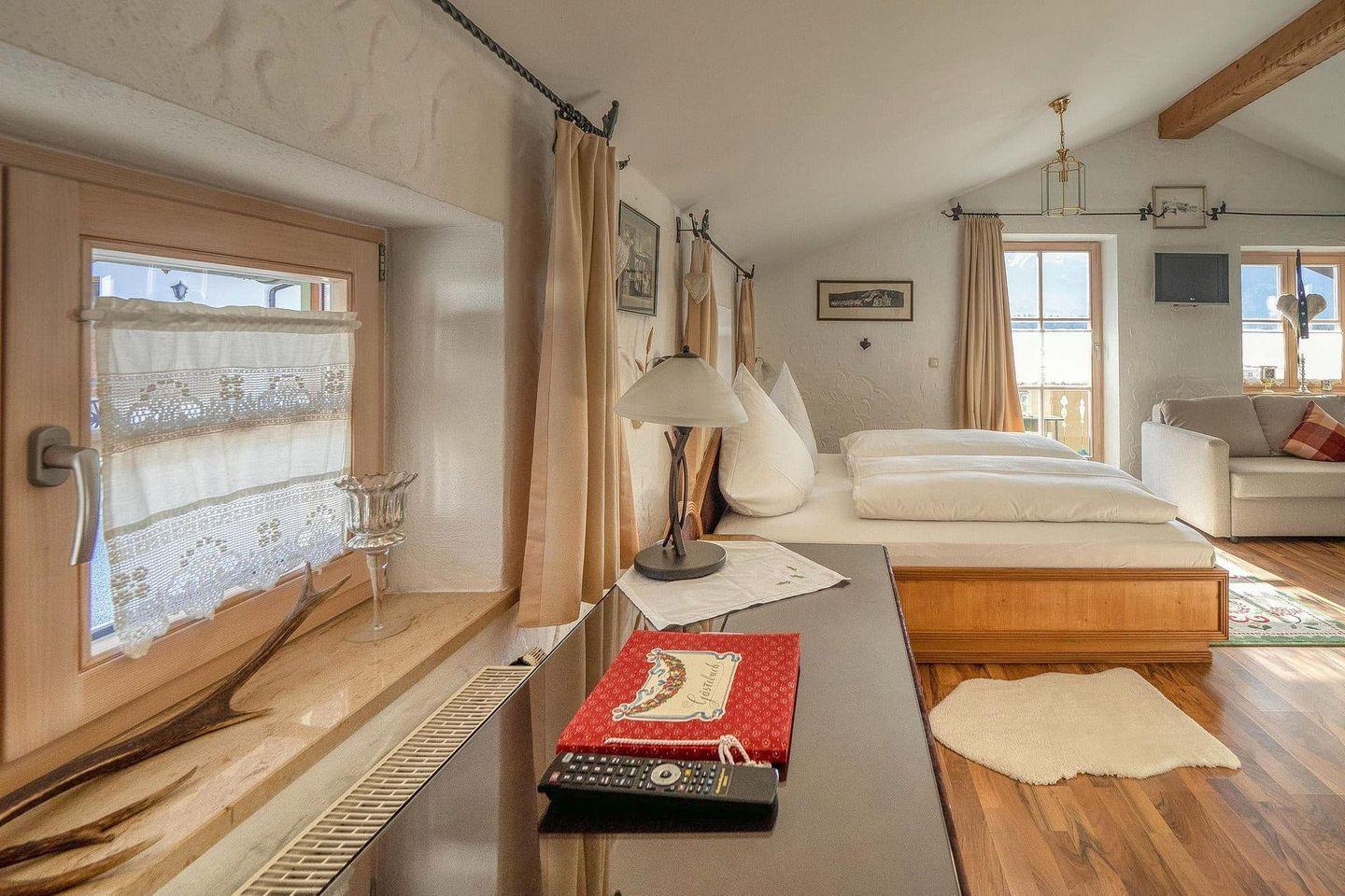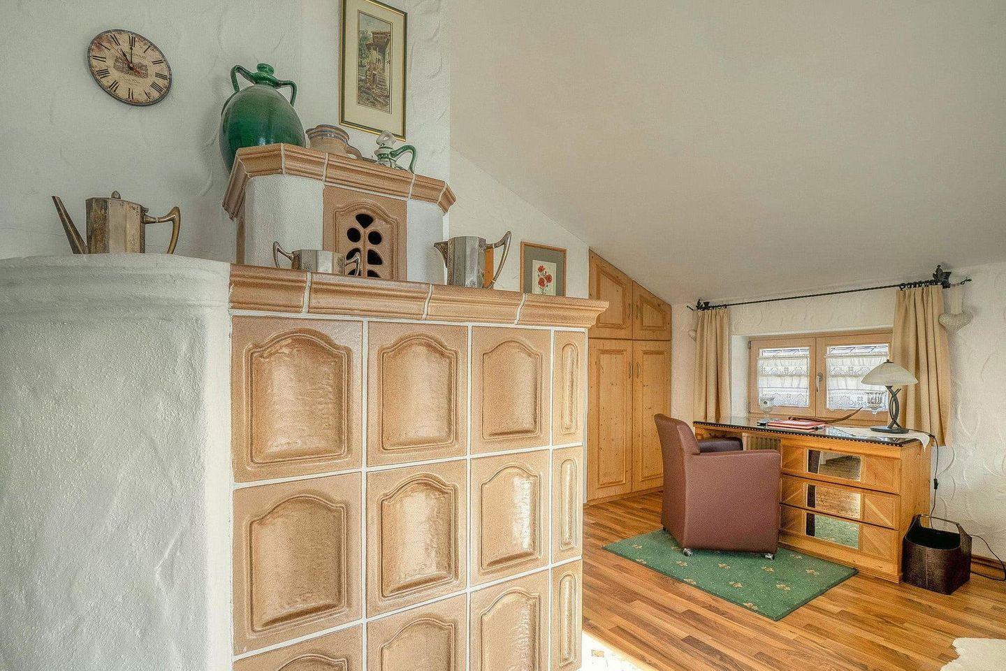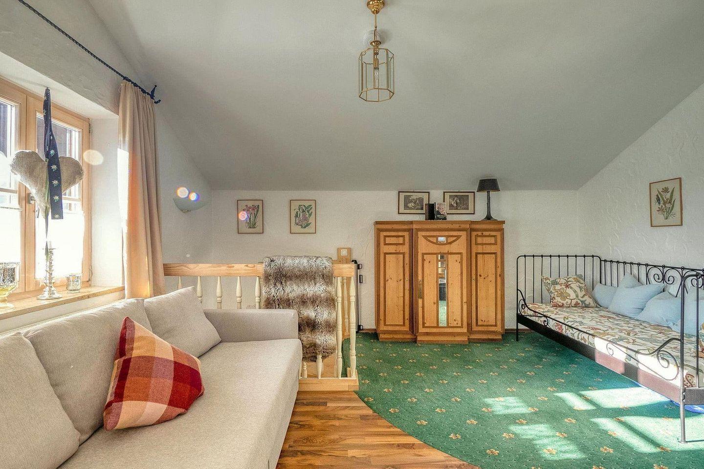 Im Obergeschoss erwartet Sie ein großzügiges Schlafzimmer mit Doppelbett, zusätzlichem Einzelbett und Schlafsofa sowie Badezimmer, und WC. Ein traditioneller Kaminofen sorgt hier für wohlige Wärme und eine behagliche Atmosphäre. Vom Balkon genießen Sie einen beeindruckenden Panoramablick auf die umliegende Bergwelt mit Kehlsteinhaus, Hohes Brett, Jenner und Hohem Göll – ein Anblick, der zu jeder Jahreszeit begeistert.