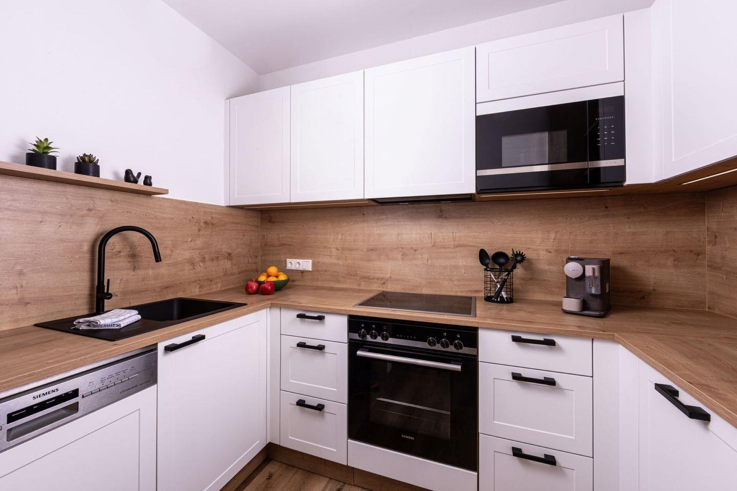 Das separate Schlafzimmer ist mit einem komfortablen Doppelbett und Kleiderschrank ausgestattet. Im gemütlichen Wohnzimmer laden eine bequeme Sofaecke mit Flachbild-TV und ein Esstisch zum Verweilen ein. Die voll ausgestattete Küche bietet alles, was Sie zum Kochen und Genießen brauchen – von Ceranherd, Backofen und Spülmaschine bis hin zu Mikrowelle, Kühlschrank mit Gefrierfach, Kaffeemaschine, Nespresso-Maschine, Wasserkocher und Toaster. Das moderne Bad verfügt über eine ebenerdige Dusche, WC und Haartrockner.