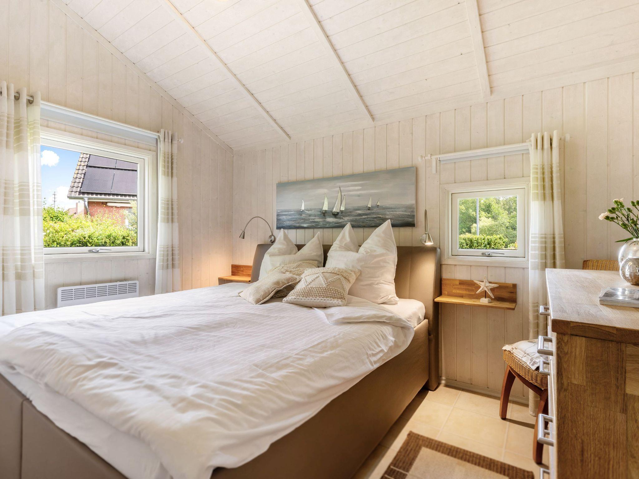 Holzwinkelbungalow mit ca. 94 qm Grundfläche, aufgeteilt in: großer Wohnbereich mit offenem Giebel und Kaminofen; 2 Schlafzimmer mit je 1 Doppelbett (160x200cm bzw. 180x200cm) und 1 Schlafzimmer mit Schlafsofa (140x200cm); offene Küche mit Geschirrspülmaschine; Dusche/WC; Waschmaschine und Trockner, Sauna, WLAN (Glasfaseranschluss). Außerdem: 2 möblierte Terrassen, großes, umzäuntes Grundstück mit Meerblick über die Wiesen, Strandkorb, Parkplatz am Haus, abschließbarer Fahrradschuppen, Nichtraucher, Hunde gestattet. Kaution Euro 250,00 mit der Restzahlung überweisen, Strom nach Verbrauch Euro 0,40 kWh.