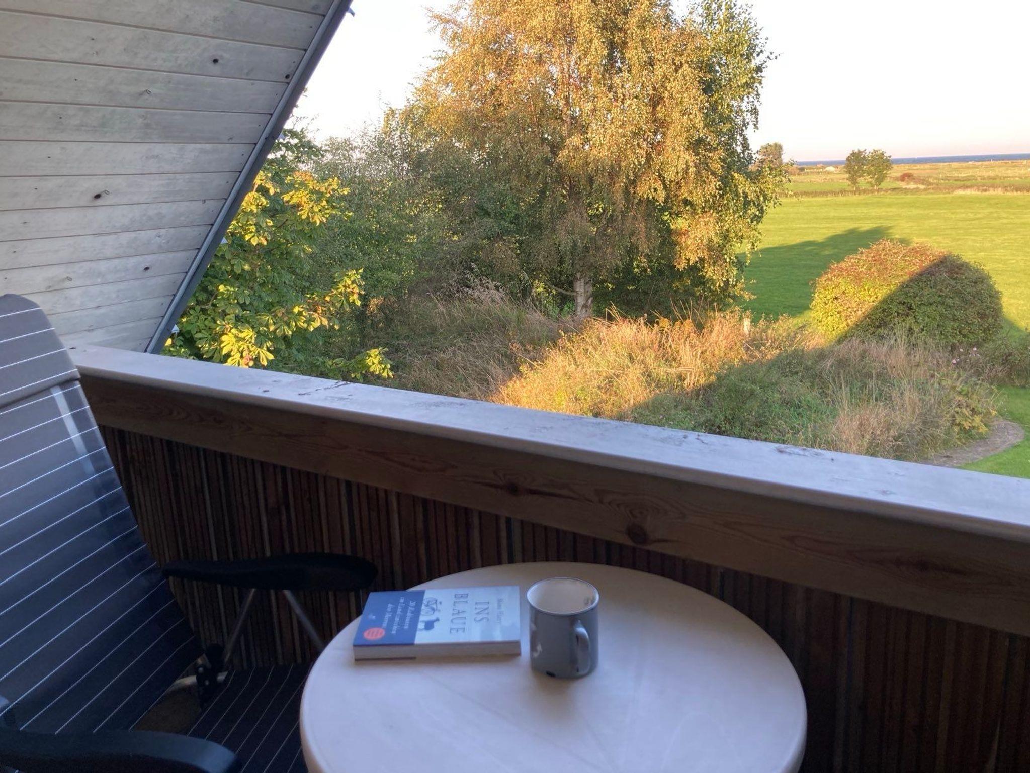 Vom Wohnbereich führt eine offene Treppe ins Obergeschoß. Dort erwartet sie ein zweites Schlafzimmer mit zwei getrennt stehenden Betten sowie zwei Kommoden und ein weiteres Wohnzimmer, von dem Sie auf den kleinen, möblierten Balkon gelangen. Dort genießen Sie die Ruhe und einen fantastischen Blick über die Felder zur Ostsee. In dem 2. Wohnbereich gibt es ebenfalls ein TV-Gerät.