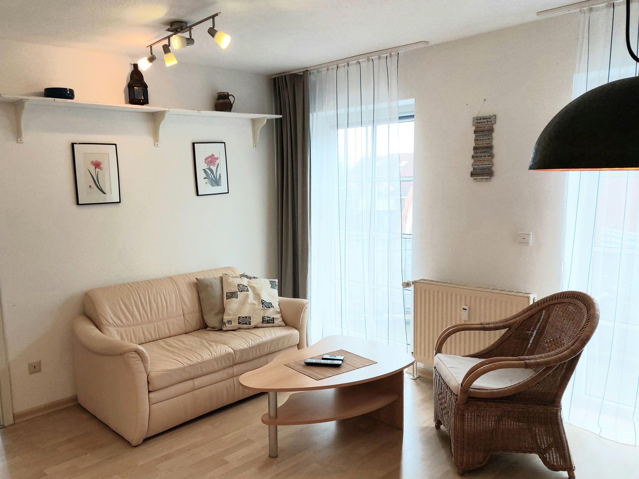 Aufgeteilt in: Wohnzimmer mit Essbereich, Schlafzimmer mit Doppelbett (140x200 cm mit einteiliger Matratze), Küchenzeile im Wohnbereich, Duschbad/WC, Balkon zur Ostseite, WLAN, PKW-Stellplatz und Fahrradbügel