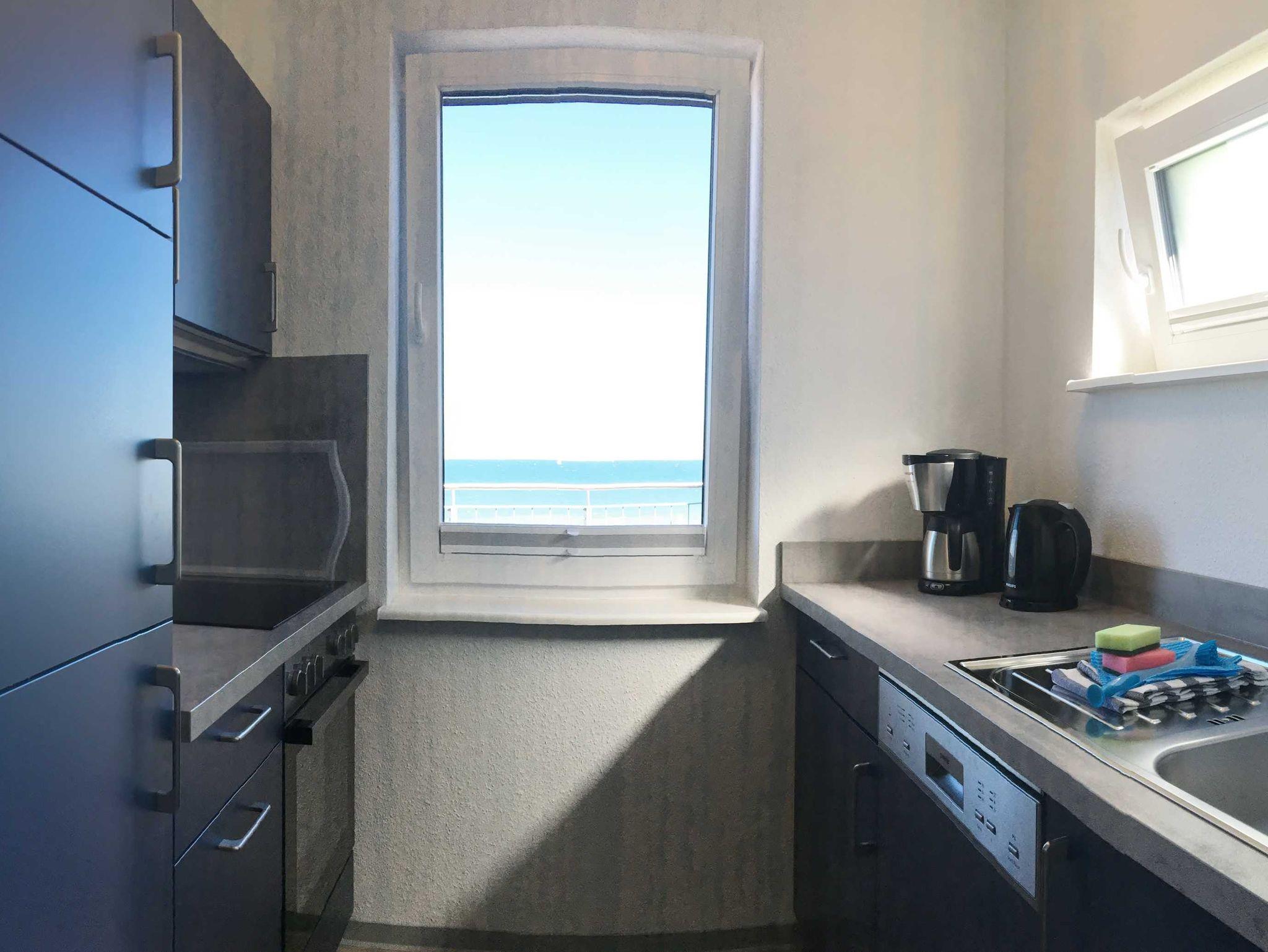 In der separaten Küche mit 4 Glaskeramik-Kochfeldern, Spüle, Kühlschrank, Backofen, Geschirrspüler, Kaffeemaschine, Toaster und Wasserkocher können Sie sich Ihr Essen selbst zubereiten und anschließend mit dem Blick auf die Ostsee genießen.