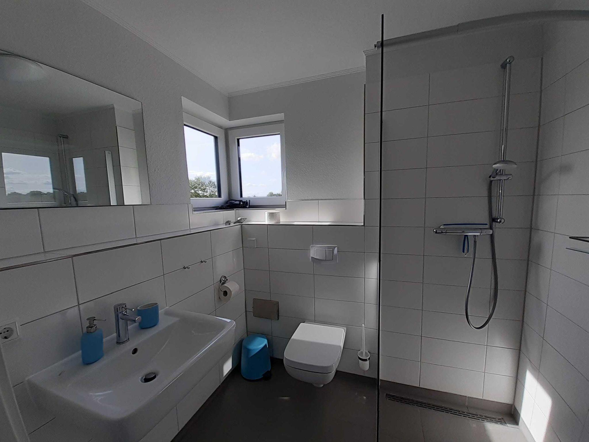 Im modernen Duschbad mit Fenster sorgt ein elektrischer Handtuchwärmer und die Fußbodenheizung für angenehme Wärme.