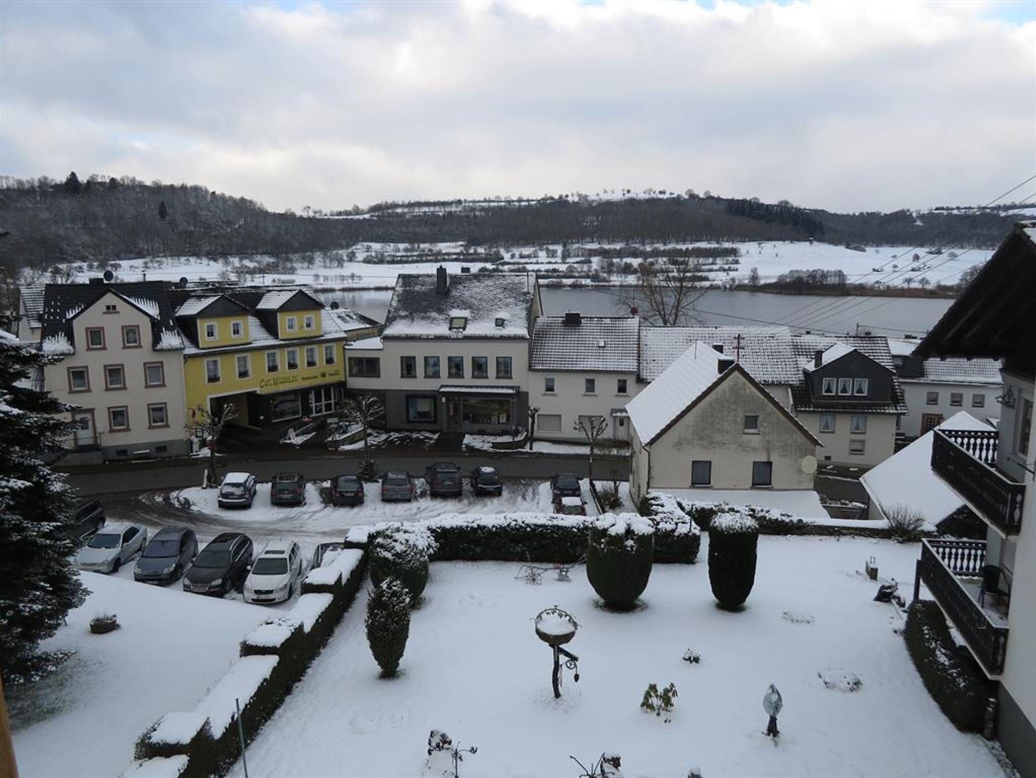 Im 1. Stock befindet sich die Küche, ein Schlafzimmer mit einem Badezimmer und ein Wohn- und Essraum. Im ausgebauten Dachgeschoss befindet sich ein weiterer Wohnraum mit wunderbarem Blick auf das Schalkenmehrener Maar. Ebenso ist hier ein zweites Schlafzimmer mit eigenem Bad vorhanden, so dass diese Wohnung sehr gut für vier Personen geeignet ist.