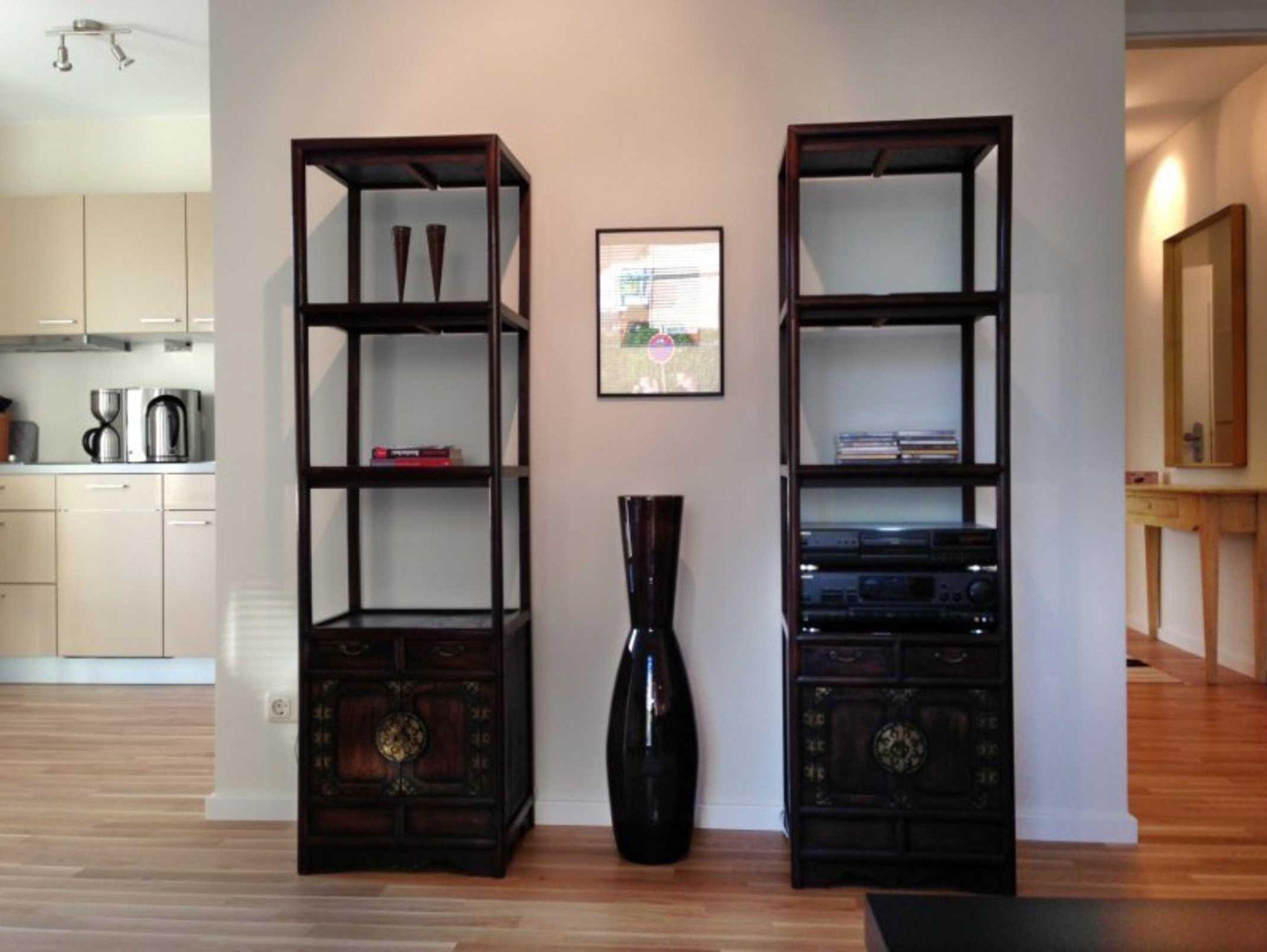 Die lichtdurchflutete Erdgeschoss-Wohnung mit Eichenparkett verfügt über einen angenehmen Grundriss mit Eingangsbereich, ein geräumiges Schlafzimmer mit Boxspring-Betten und elektr. Rolläden, ein Badezimmer mit bodengleicher Dusche, eine offene Küche mit Essplatz für max. 4 Personen und ein Wohnzimmer (inkl. Schlafsofa für eine 3. bis 4. Person) mit großen Flügeltüren zur möblierten Terrasse.