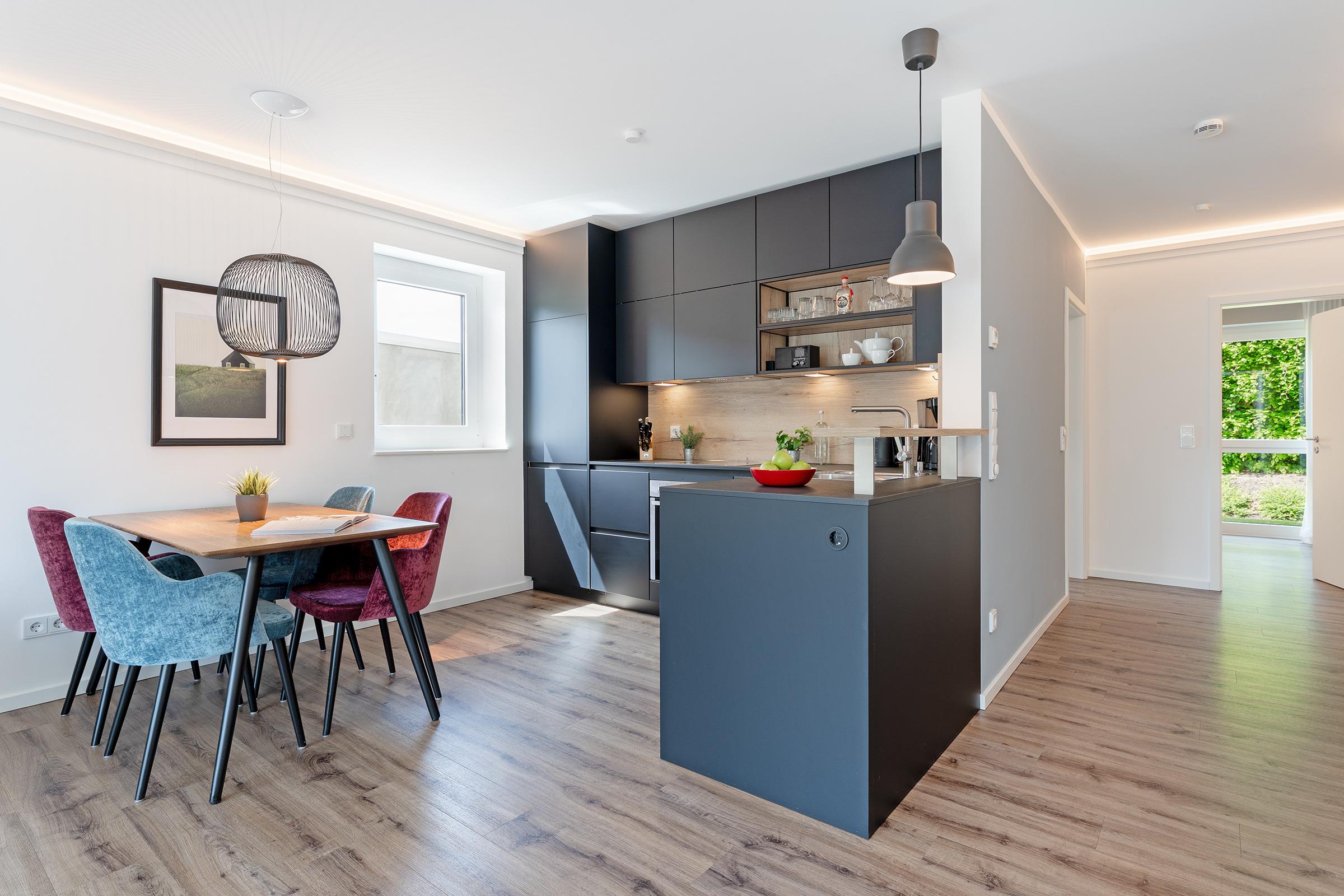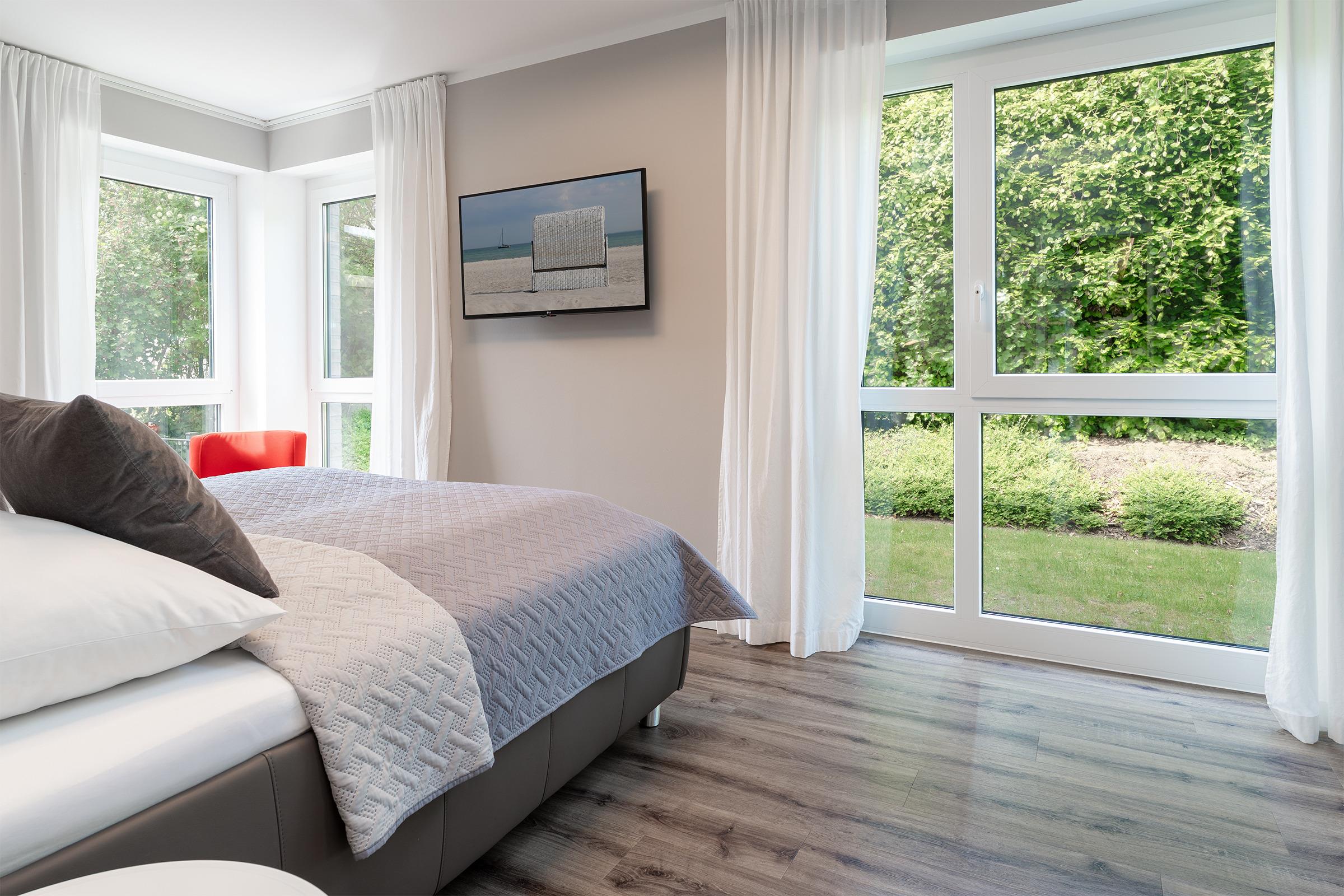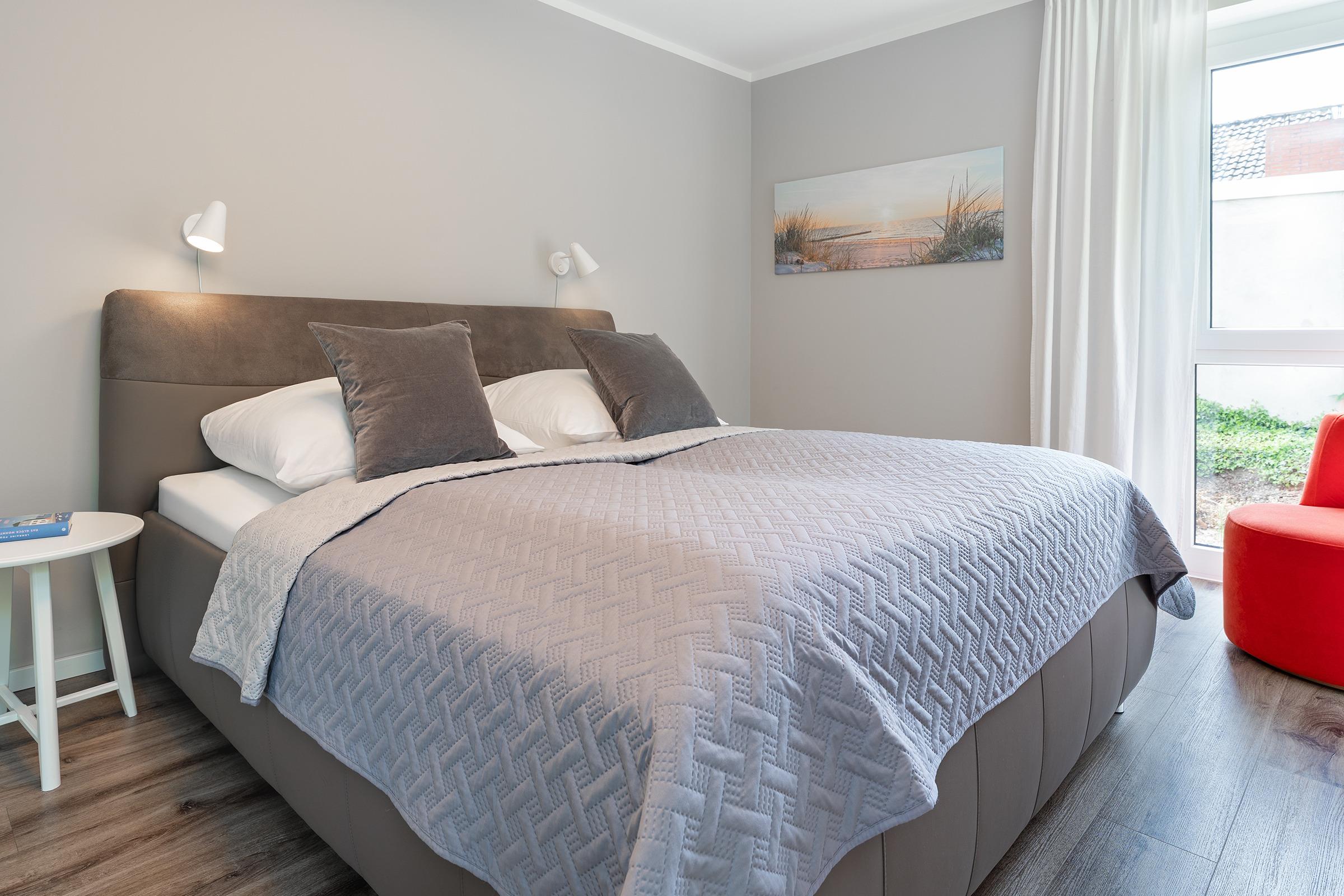 Durch die harmonischen Wandfarben und das dimmbare Voute Lichtkonzept wirken Flur und Wohnbereich besonders großzügig. Eine Schlafcouch (160x200 cm) und Smart-TV laden im Wohnzimmer zu gemütlichen Abenden ein. Eine offene moderne Küchenzeile mit 4-Feld-Induktionsherd und Backofen, Kühlschrank mit Gefrierfach, Spülmaschine, Kaffeemaschine, Toaster, Wasserkocher und hinter einer Küchenfront verstecktem Waschtrockner sowie eine Essecke runden diesen Mittelpunkt der Wohnung ab. Vom Wohnzimmer aus gelangen Sie auch auf den möblierten Balkon in Süd-Ost Ausrichtung, auf dem Sie die Sonnenstunden optimal ausnutzen können. Im Schlafzimmer mit Smart-TV verlockt ein Doppelbett (2x 90x200 cm, 2 unterschiedliche Härtegrade) zu erholsamen Nächten. Für Ihre Urlaubsgarderobe ist im Schiebetürenschrank genug Platz vorhanden. Auch das Tageslicht-Bad kann in dieser Wohnung mit Design punkten und verfügt über eine bodentiefe Dusche, Fön, WC und Schminkspiegel. In der gesamten Ferienwohnung sorgt eine Fußbodenheizung für wohlige Wärme. Zur Nachtruhe verdunkeln Sie die Wohnung mit elektrischen Außenjalousien.
