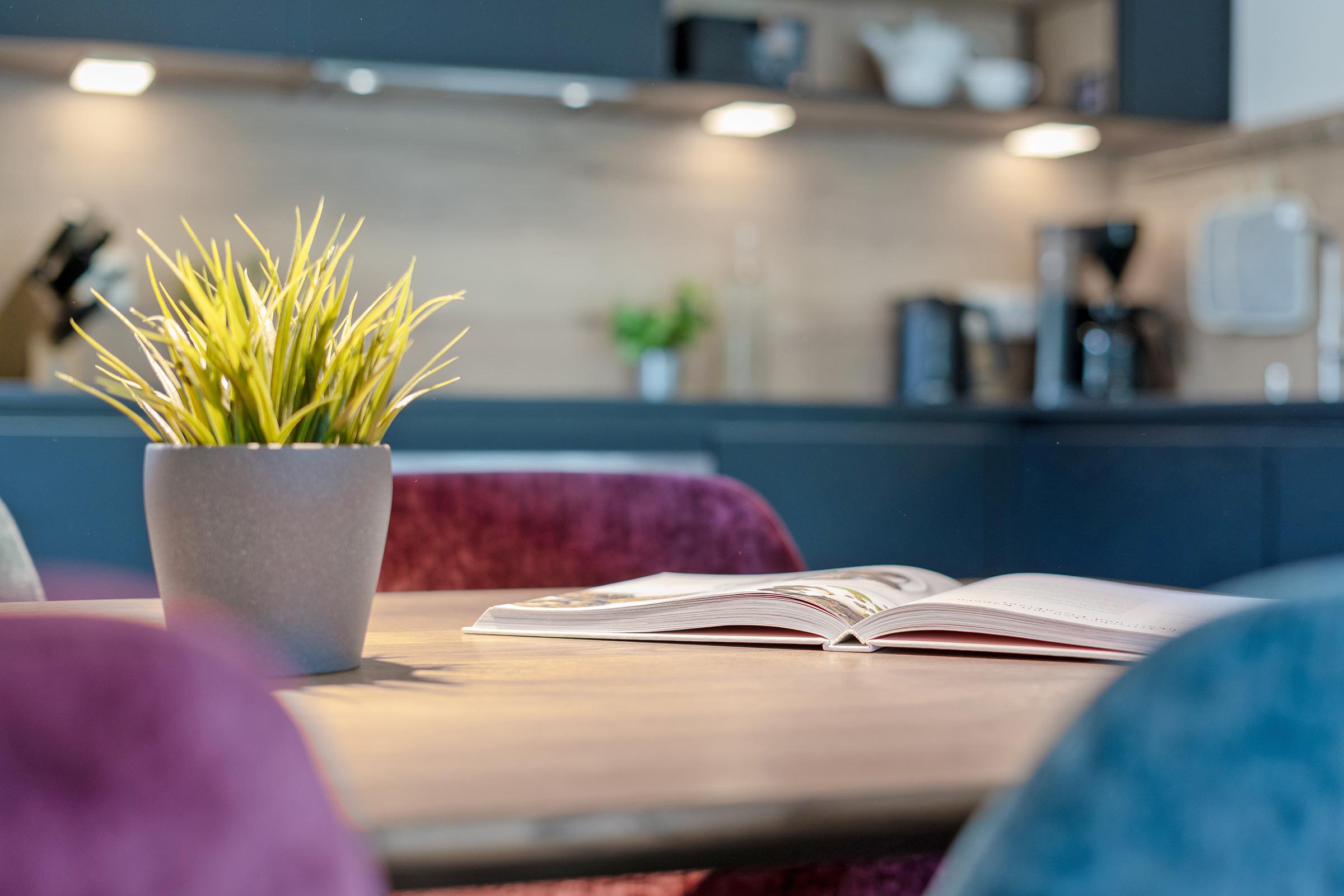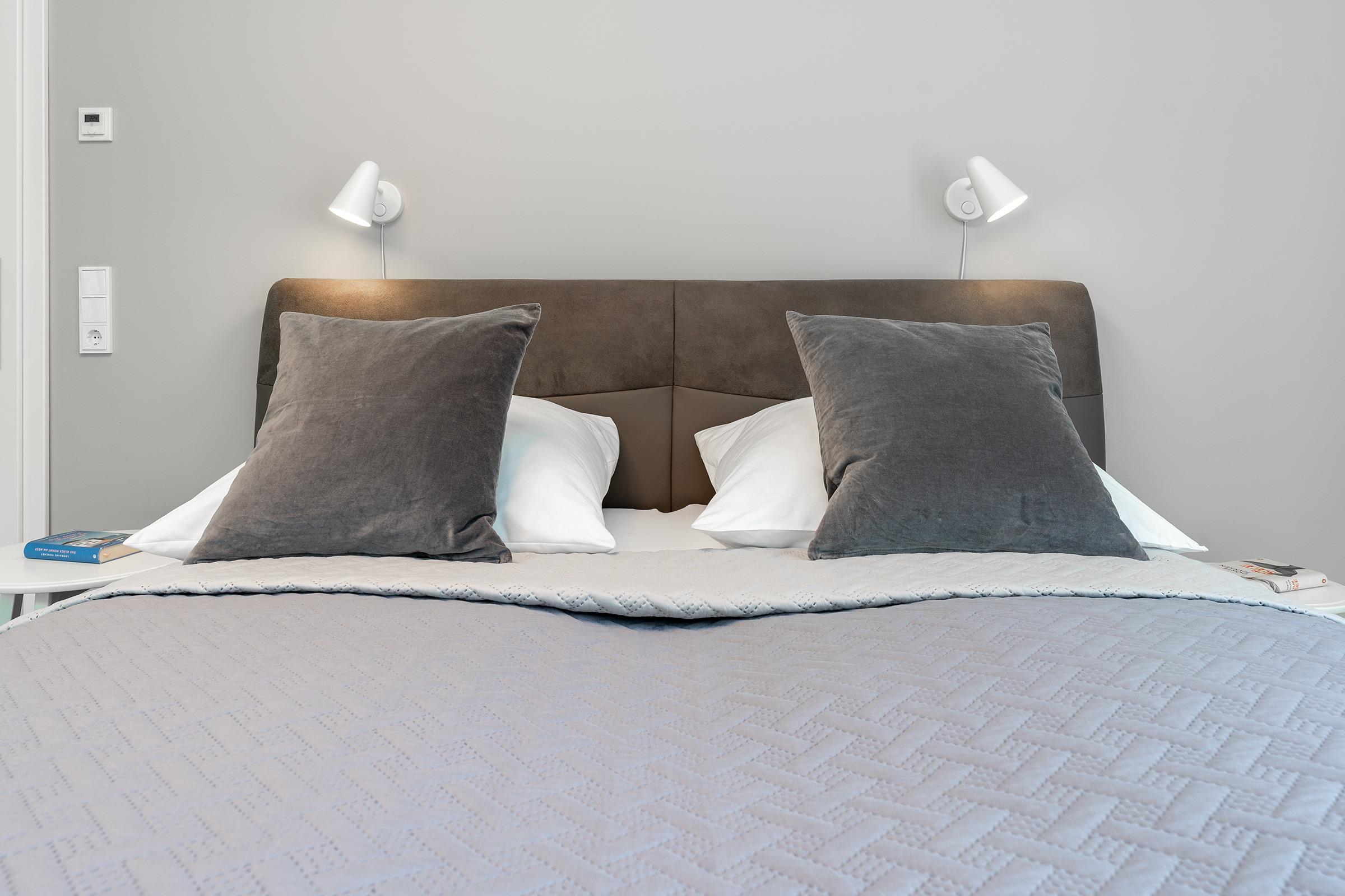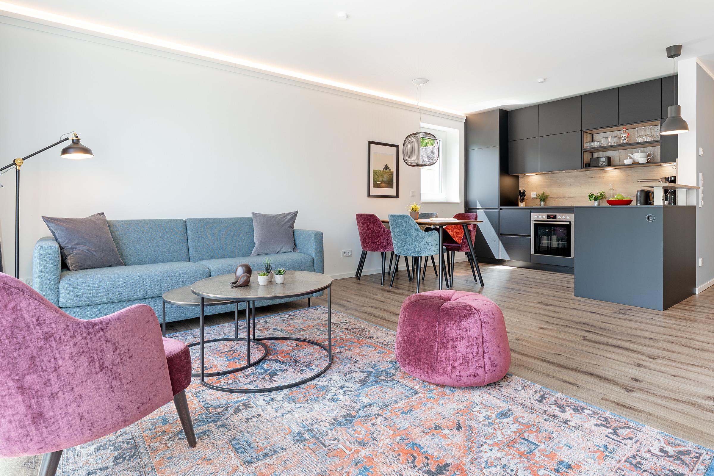 Durch die harmonischen Wandfarben und das dimmbare Voute Lichtkonzept wirken Flur und Wohnbereich besonders großzügig. Eine Schlafcouch (160x200 cm) und Smart-TV laden im Wohnzimmer zu gemütlichen Abenden ein. Eine offene moderne Küchenzeile mit 4-Feld-Induktionsherd und Backofen, Kühlschrank mit Gefrierfach, Spülmaschine, Kaffeemaschine, Toaster, Wasserkocher und hinter einer Küchenfront verstecktem Waschtrockner sowie eine Essecke runden diesen Mittelpunkt der Wohnung ab. Vom Wohnzimmer aus gelangen Sie auch auf den möblierten Balkon in Süd-Ost Ausrichtung, auf dem Sie die Sonnenstunden optimal ausnutzen können. Im Schlafzimmer mit Smart-TV verlockt ein Doppelbett (2x 90x200 cm, 2 unterschiedliche Härtegrade) zu erholsamen Nächten. Für Ihre Urlaubsgarderobe ist im Schiebetürenschrank genug Platz vorhanden. Auch das Tageslicht-Bad kann in dieser Wohnung mit Design punkten und verfügt über eine bodentiefe Dusche, Fön, WC und Schminkspiegel. In der gesamten Ferienwohnung sorgt eine Fußbodenheizung für wohlige Wärme. Zur Nachtruhe verdunkeln Sie die Wohnung mit elektrischen Außenjalousien.