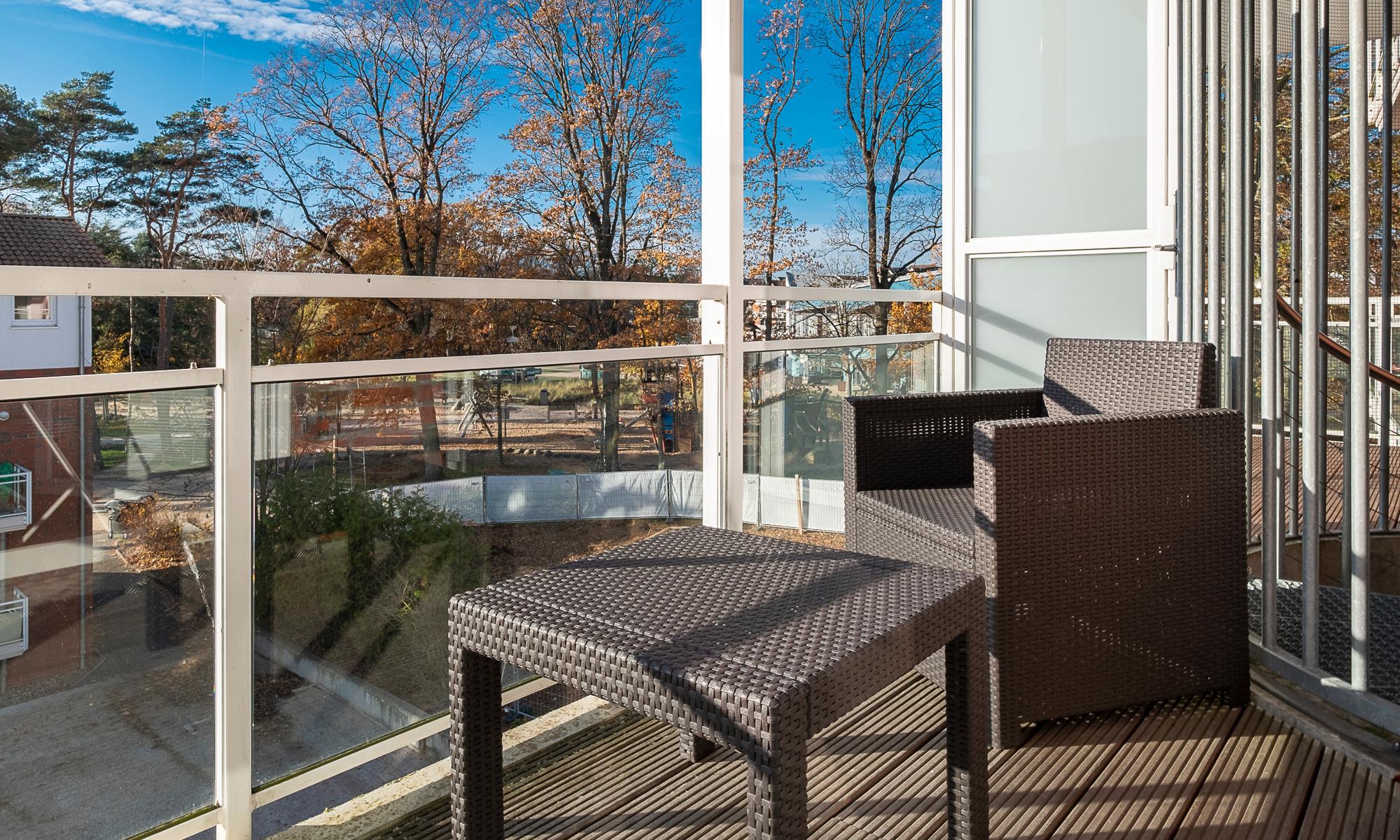 Der helle Wohn-Essbereich ist mit einer großen Sofaecke eingerichtet. Mit wenigen Handgriffen lässt diese sich in ein Schlafsofa umfunktionieren. Neben dem Flachbildfernseher (HD+) mit Smart-Funktion und der Bluetooth-Box steht Ihnen selbstverständlich kostenloses WLAN zur Verfügung. Die moderne Küche ist komplett ausgestattet, unter anderem steht Ihnen ein Kaffeevollautomat zur Verfügung und der Esstisch lädt zu geselligen Stunden ein. Der großzügige Balkon (10 m²) mit Blick auf die Ostsee ist windgeschützt. In beiden Schlafzimmern stehen bequeme Doppelbetten (1,80 x 2,00m) und geräumige Kleiderschränke. Zusätzlich verfügen sie über Smart-Flachbildfernseher und einen eigenen kleinen Balkon Richtung Kurpark. Die Badezimmer verfügen über große Duschen und unterfahrbare Waschbecken. Diese Wohnung ist daher auch für Rollstuhlfahrer geeignet.