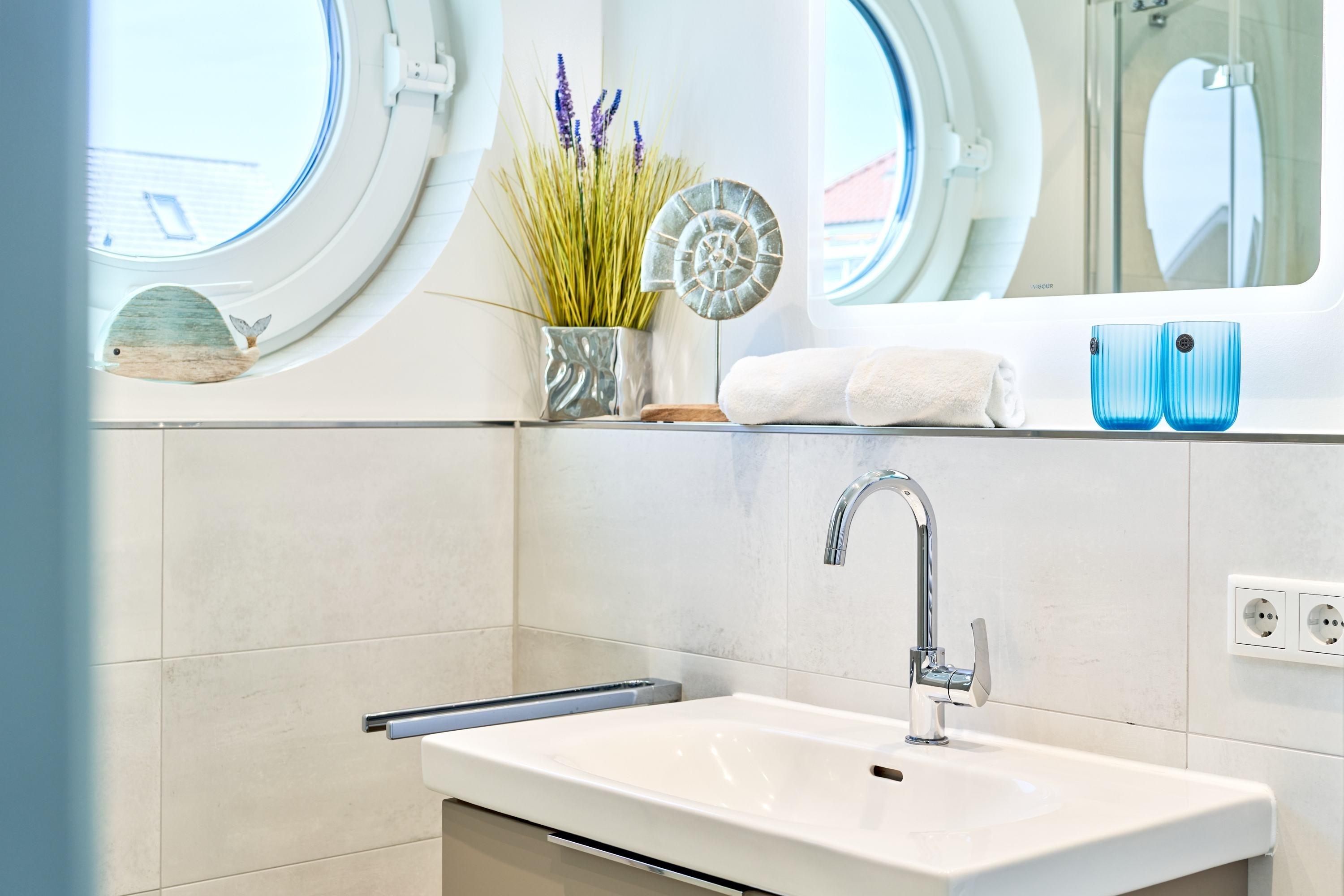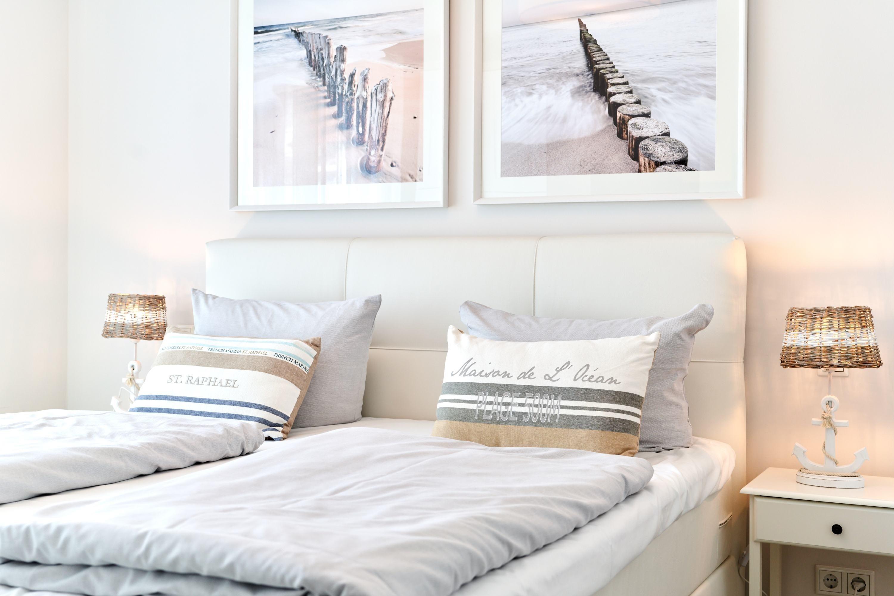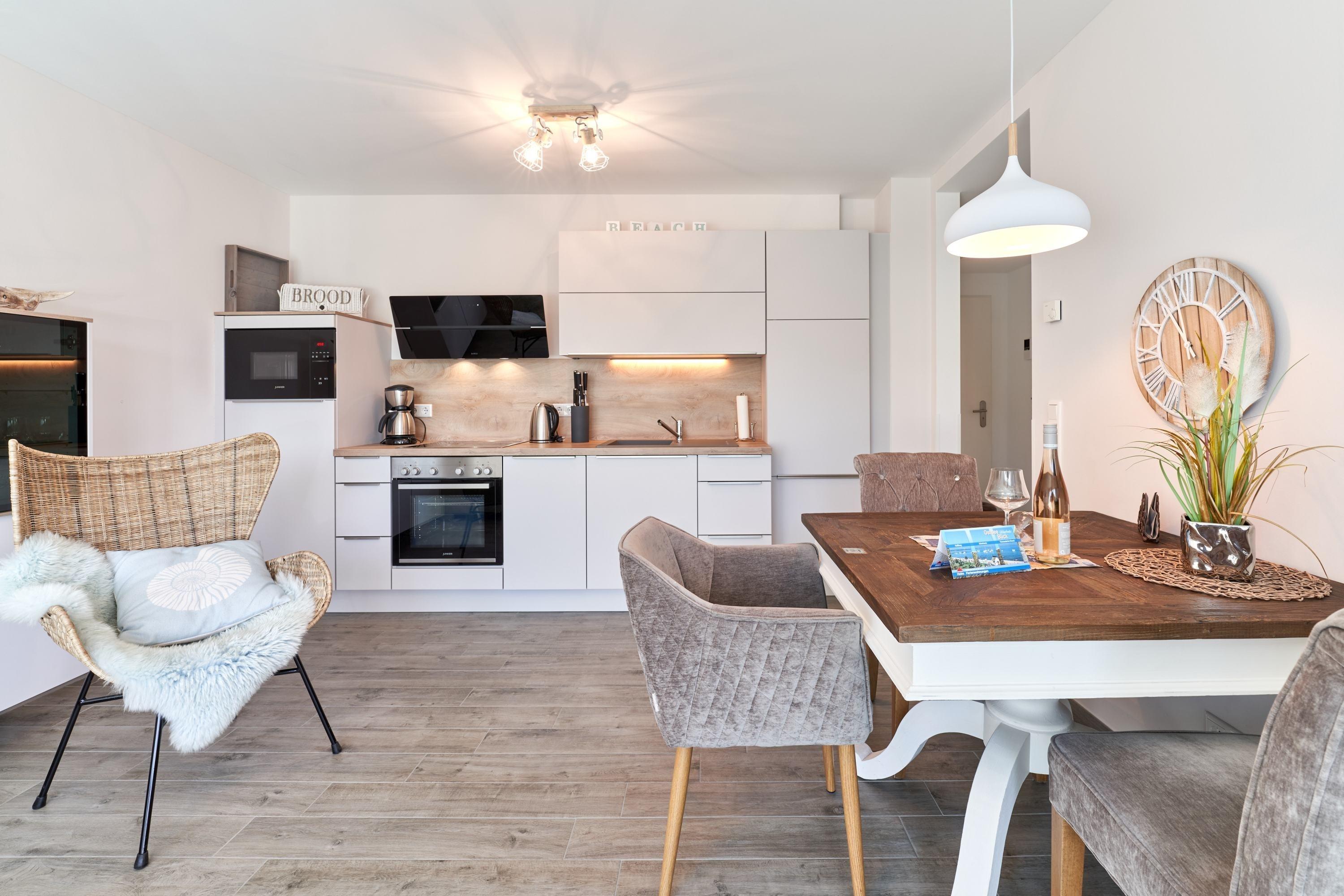 Die Ferienwohnung strahlt eine helle, behagliche Gemütlichkeit aus. Die offene Küche im Wohn-Essbereich ist komplett ausgestattet und lässt keine Wünsche offen; Küchenzeile mit Backofen, Ceran-Kochfeld, Elektroherd, Dunstabzug, Geschirr, Geschirrspüler, Kühlschrank incl. Gefrierfach, Mikrowelle, Filterkaffeemaschine, Pad-Kaffeemaschine, Toaster, Wasserkocher. Im Wohnbereich finden Sie alles, was zu einem Wohlfühlbereich gehört; ein Ecksofa, ausziehbar als Schlafmöglichkeit, Wohnzimmertisch (Coffee Table), TV SAT/Kabel, Blu-ray/CD-Player, Radio, TV-Board, Geschirrschrank, Esstisch mit 3 Stühlen, bodentiefe Fenster, elektrische Fensterrollläden. Das Schlafzimmer ist mit einem Boxspringbett (1,80 x 2,00m) ausgestattet und verfügt über einen Kleiderschrank, 2 Nachttische, TV SAT/KABEL, einen Spiegel sowie bodentiefe Fenster und Außenrollläden. Ein Tageslicht-Duschbad mit Dusche und Handtuchheizkörper, Radio, Fön, Kosmetikspiegel.