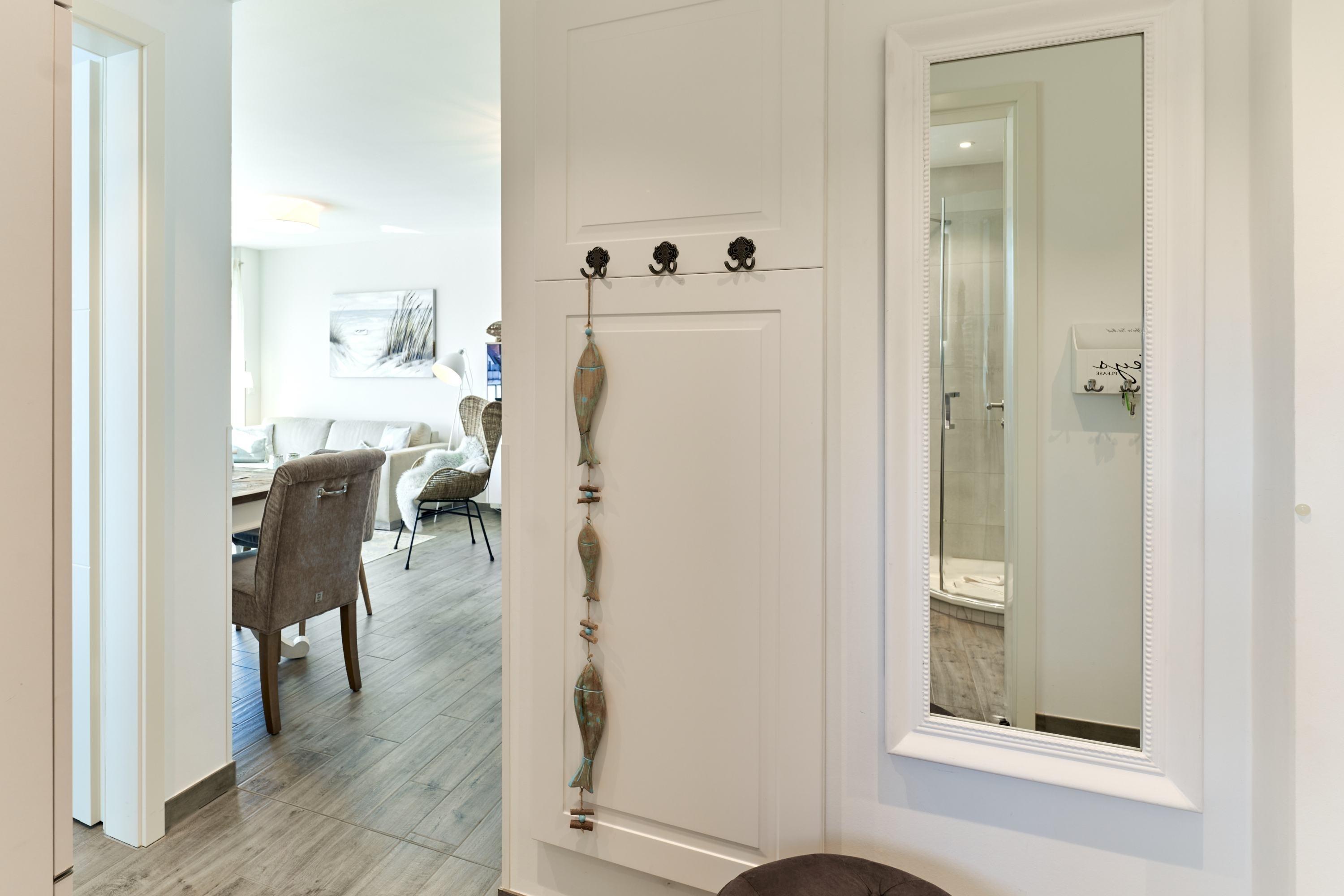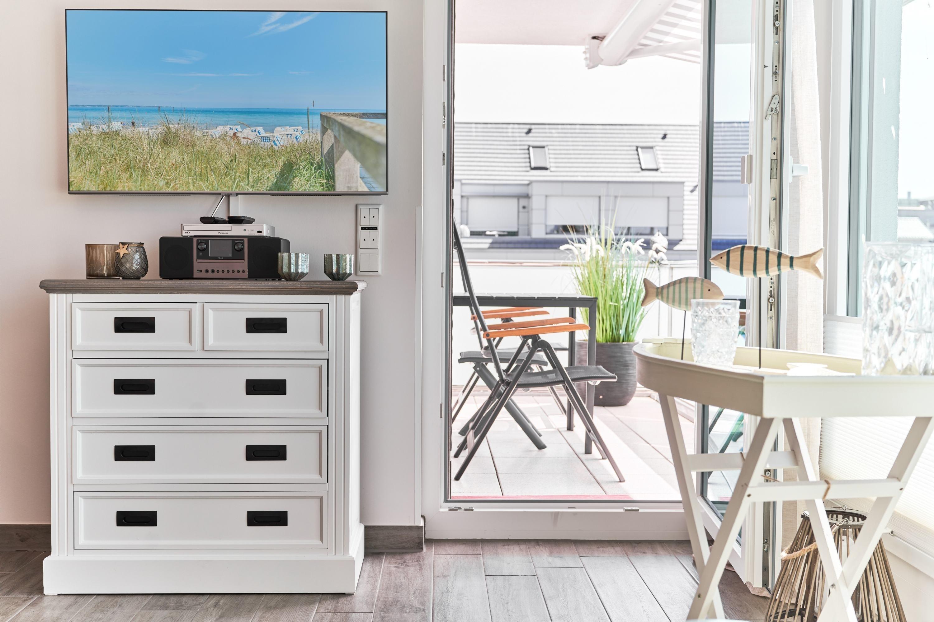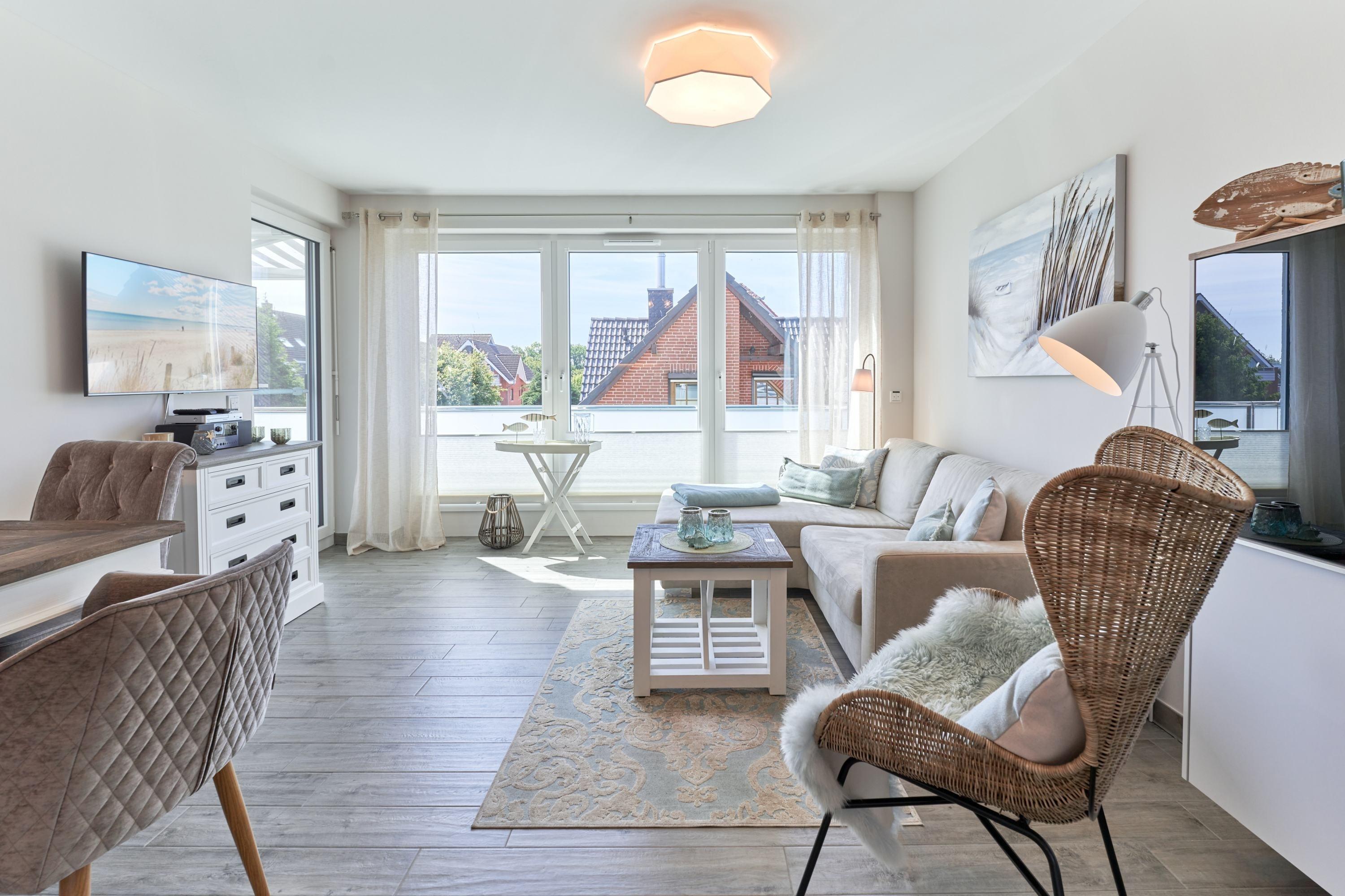 Tolle 2-Zimmer-Ferienwohnung im 2. OG, bequem mit dem Fahrstuhl zu erreichen. Südbalkon, Außenrollläden, kostenfreies WLAN, Tiefgaragenstellplatz mit E-Ladestation, (Durchfahrthöhe 2,00 m) Strandkorb am nahegelegenen Strand (saisonbedingt 15.05. – 15.09.) inklusiv.