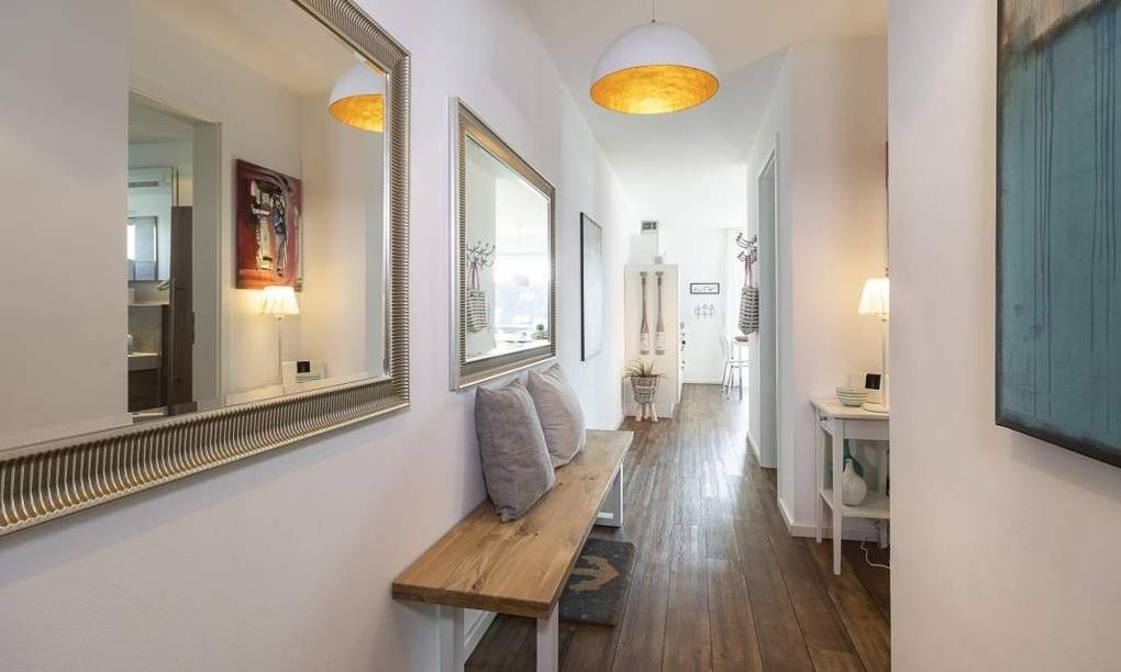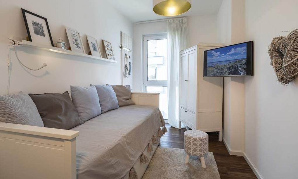 Die helle und lichtdurchflutete Wohnung ist modern und gleichzeitig gemütlich eingerichtet. Betreten Sie die Wohnung über einen hellen und einladenden offenen Flurbereich. In der gesamten Wohnung finden Sie bodentiefe Fenster mit elektrischen Rollläden und Fußbodenheizung, die schallschluckenden Fußbodenplanken sind im Yachtdesign verlegt. Im ersten Schlafzimmer genießen Sie einen herrlichen Blick auf das Meer und den Strand der Lübecker Bucht. Hier erkennen Sie spätestens den Zusammenhang in der Namensgebung der Ferienwohnung: Sand et Meer. An das Schlafzimmer schließt sich das Bad an. Hier finden Sie eine edle Designfliese im Kreuzverbund, die auf die geschmackvolle Sanitäreinrichtung abgestimmt ist. Ein besonderes Highlight des Badezimmers ist die Walk-in-Dusche, von der Sie durch ein breites Lichtband während des Duschens den wunderbaren Meerblick aufnehmen können. Das gemütliche zweite Schlafzimmer ist mit einem Einzelbett ausgestattet, bietet einen schönen Teil-Meerblick und ist ein Rückzugsort zum Verweilen und Entspannen. Selbstverständlich stehen in allen Zimmern ein Flatscreen-TV, freies WLAN und eine Radio-CD-Anlage zur Verfügung.