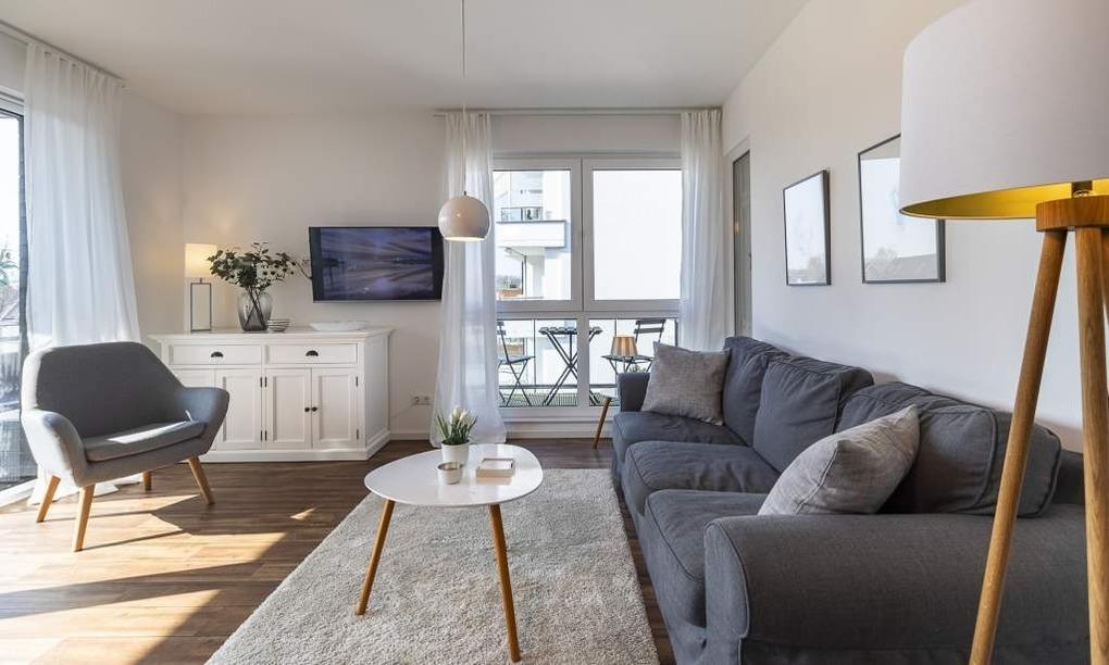 3-Zimmer-Ferienwohnung, ca. 62 m², 2. OG, zwei Schlafzimmer, halb-umlaufendem Balkon und Teil-Meerblick