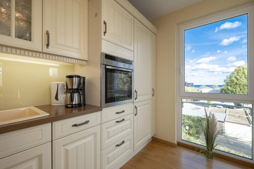 Diese modern und mit Liebe zum Detail eingerichtete Ferienwohnung, bietet Ihnen einen gemütlichen Wohn-Essbereich. Neben dem modernen Flachbildfernseher steht Ihnen eine HiFi-Anlage mit CD-Player zur Verfügung. Kostenloses WLAN ist selbstverständlich. Der überdachte Balkon mit Blick auf die Ostsee ist mit Tisch, Stühlen und einem Sonnenschirm ausgestattet. Die helle Küche im Landhausstil ist komplett ausgestattet und lädt zum aktiven Kochen ein.[nbsp] Neben einer Filterkaffeemaschine lädt eine Nespresso-Kapselmaschine zu einem perfekten Kaffeegenuss ein. Hier steht auch eine Waschmaschine zur Verfügung.