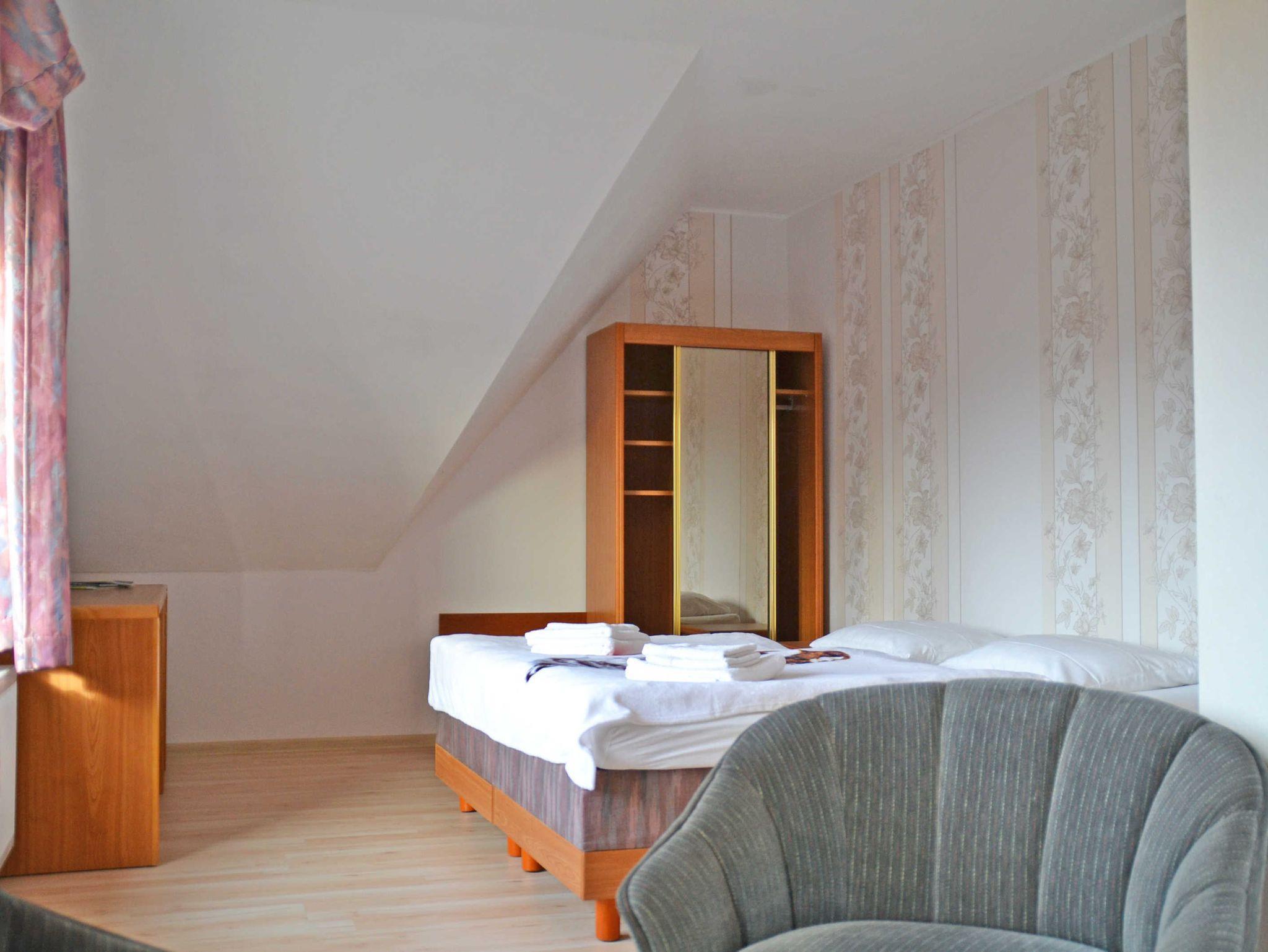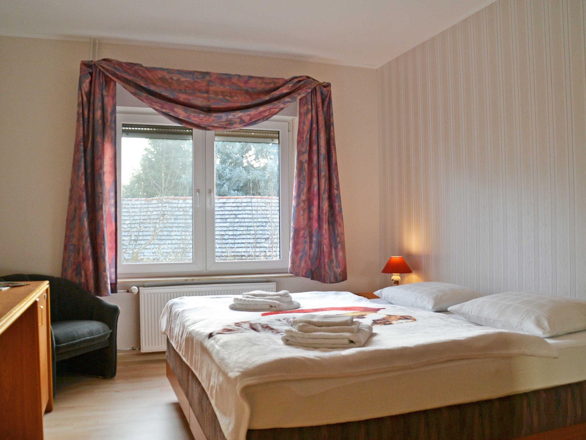 Die Ferienwohnung ist großzügig geschnitten und bietet viel Platz in ruhiger und dennoch zentraler Lage. Das Einzelbett ist 100 x 200 cm groß, die Doppelbetten sind jeweils 200 x 200 cm und können auch einzeln gestellt werden. Die Ferienwohnung ist mit Laminat ausgestattet. Je nach Bettenbelegung stehen die Zimmer zur Verfügung.