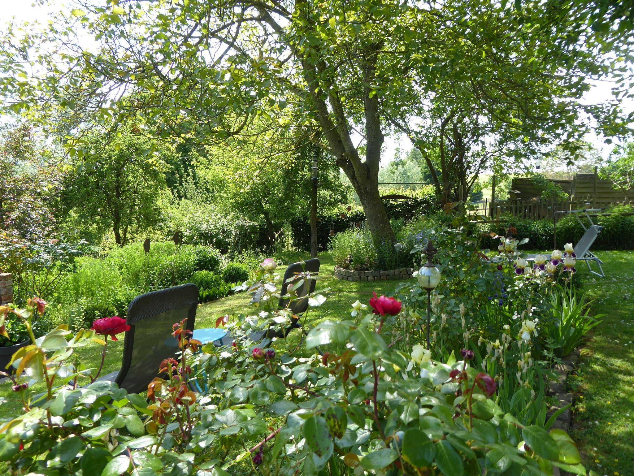 Wenige Meter hinter dem Haus der Ferienwohnungen befindet sich ein großer sehr gepflegter Garten, der mit seinem alten Baumbestand, den liebevoll gestalteten Blumenbeeten und Sitzgelegenheiten genug Möglichkeiten bietet, einen ereignisreichen Tag ausklingen zu lassen