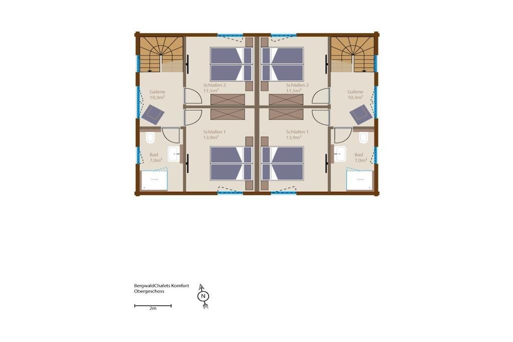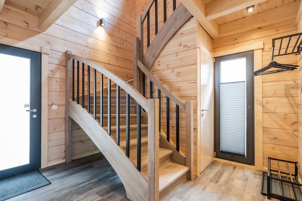 Unsere zwei Bergwaldchalets Komfort bieten viel Platz für bis zu fünf Personen. Vom Flur aus gelangt man über eine breite Massivholz-Treppe in das Obergeschoss. Im Erdgeschoss befinden sich der Wohn-/Essbereich mit Kaminofen, eine großzügige top ausgestattete L-Küche und ein Duschbad mit integrierter finnischer Blockhaussauna Im Obergeschoss sind zwei Schlafzimmer mit superbequemen Boxspringbetten, großen Schwebetürenschränken, ein SmartTV und Soundbar, das große Duschbad mit großer GladDusche sowie eine Galerie mit einem Schlafsessel Jedes Chalet hat eine eigene E- Ladesäulle/Walbox