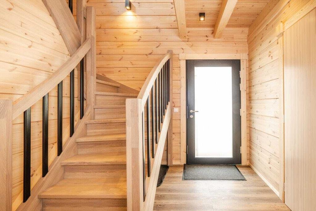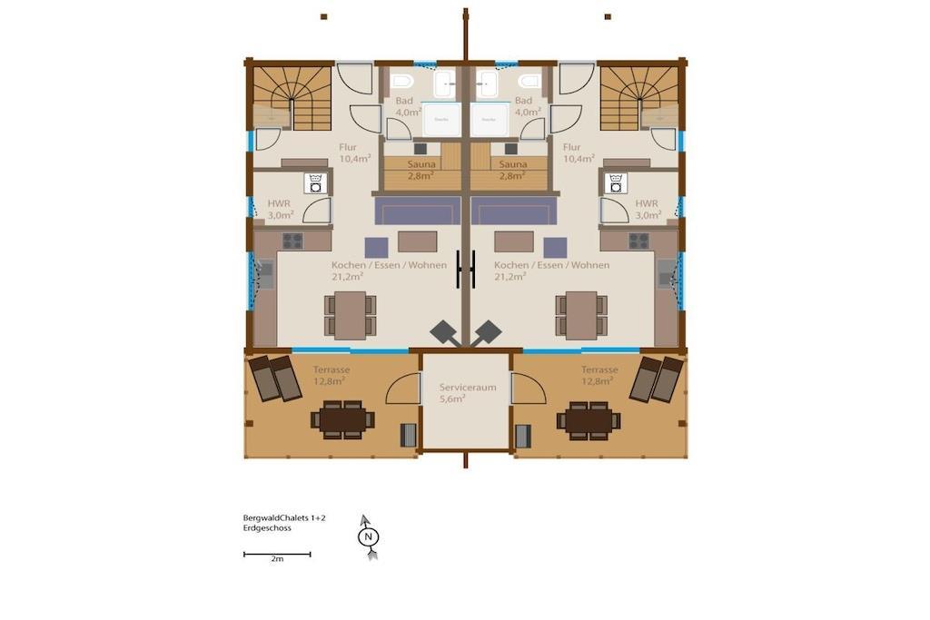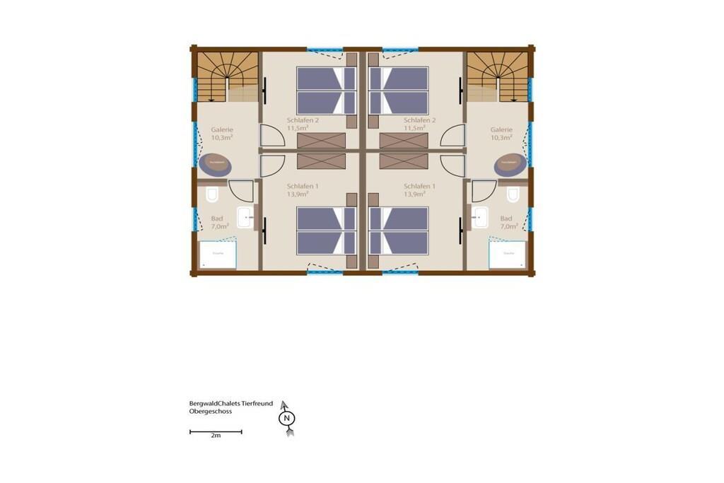 Unsere zwei Bergwaldchalets Tierfreund bieten viel Platz für bis zu vier Personen und bei Bedarf einen Hund. Vom Flur aus gelangt man über eine breite Massivholz-Treppe in das Obergeschoss. Im Erdgeschoss befinden sich der Wohn-/Essbereich mit Kaminofen, eine großzügige top ausgestattete L-Küche und ein Duschbad mit integrierter finnischer Blockhaussauna Im Obergeschoss sind zwei Schlafzimmer mit superbequemen Boxspringbetten, großen Schwebetürenschränken, ein SmartTV und Soundbar, das große Duschbad mit großer GladDusche sowie eine Galerie mit ausreichend Platz z.B. auch für den "besten Freund Jedes Chalet hat eine eigene E- Ladesäulle/Walbox