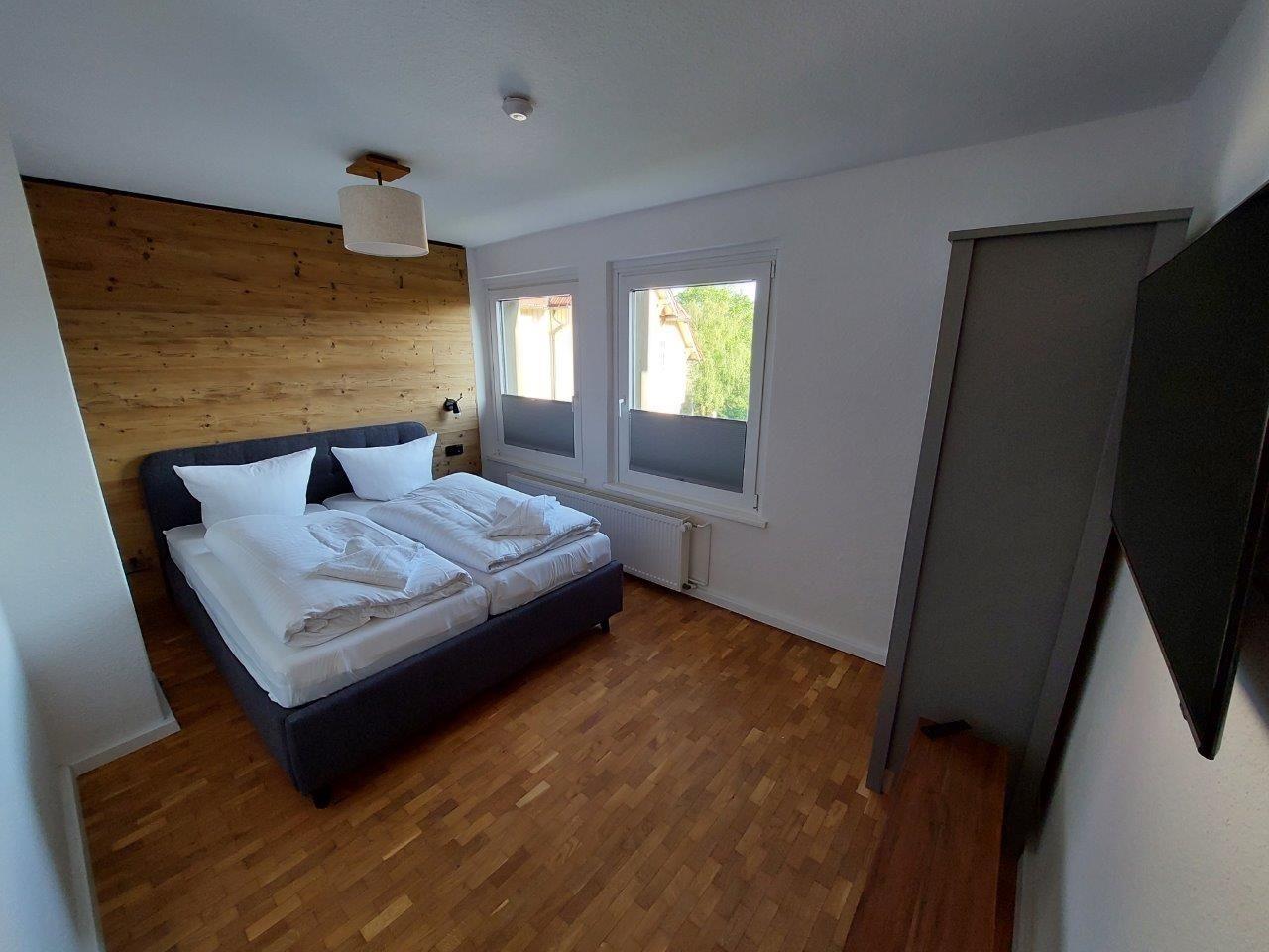 Im Obergeschoss liegen die drei Schlafzimmer mit Doppelbetten (1x180xm, 2x 160cm breit). Jeder Raum verfügt über einen Smart-TV. Dank zweier voll ausgestatteter Bäder gibt es keinen Stau am Morgen.