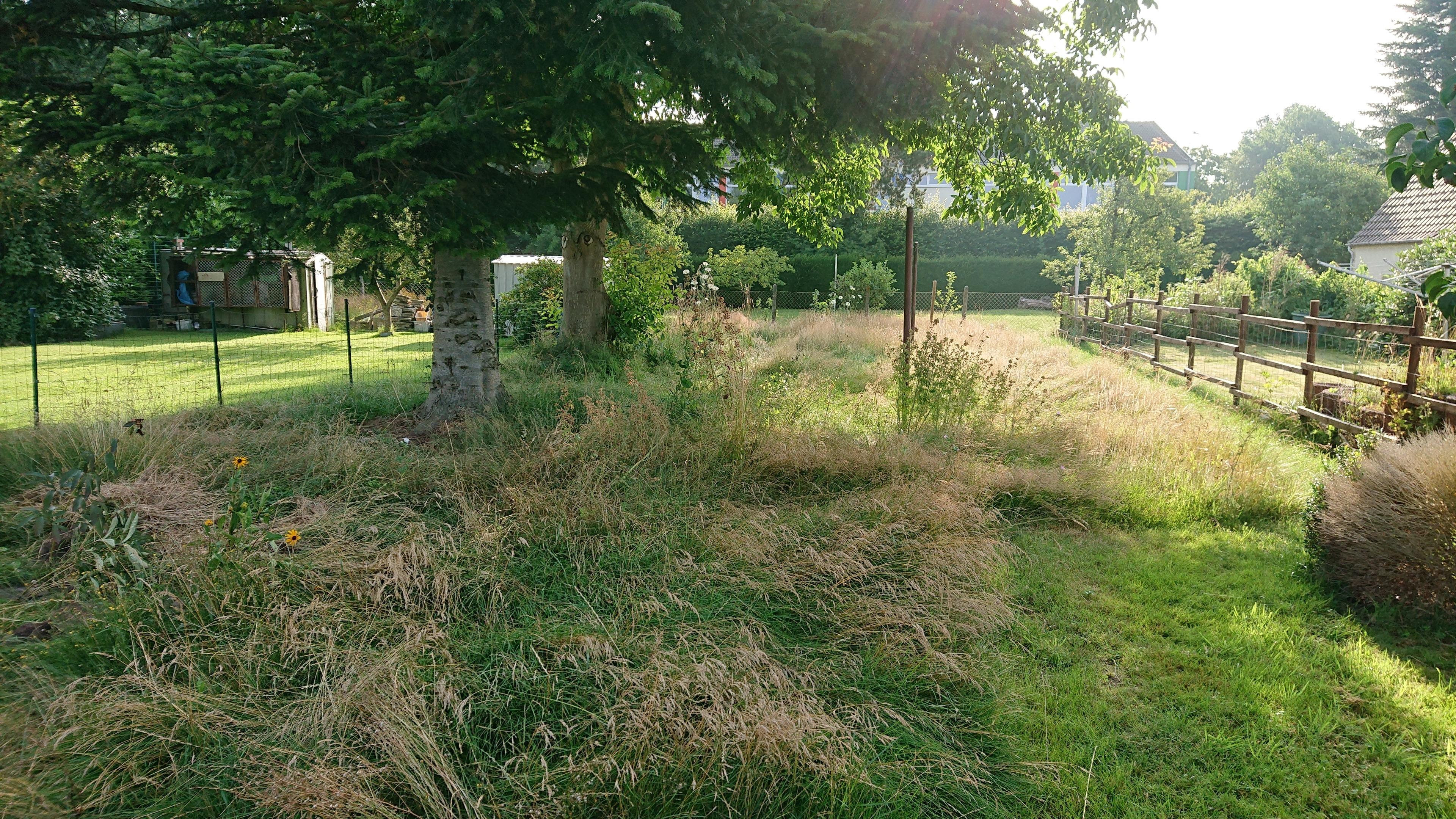 Auf dem 915 qm großen Grundstück lässt es sich wunderbar ausspannen ... Fast die Hälfte des Grundstücks wurde der Natur überlassen, Baumbestand und eine Blumenwiese sorgen für Insekten- und Tierschutz.