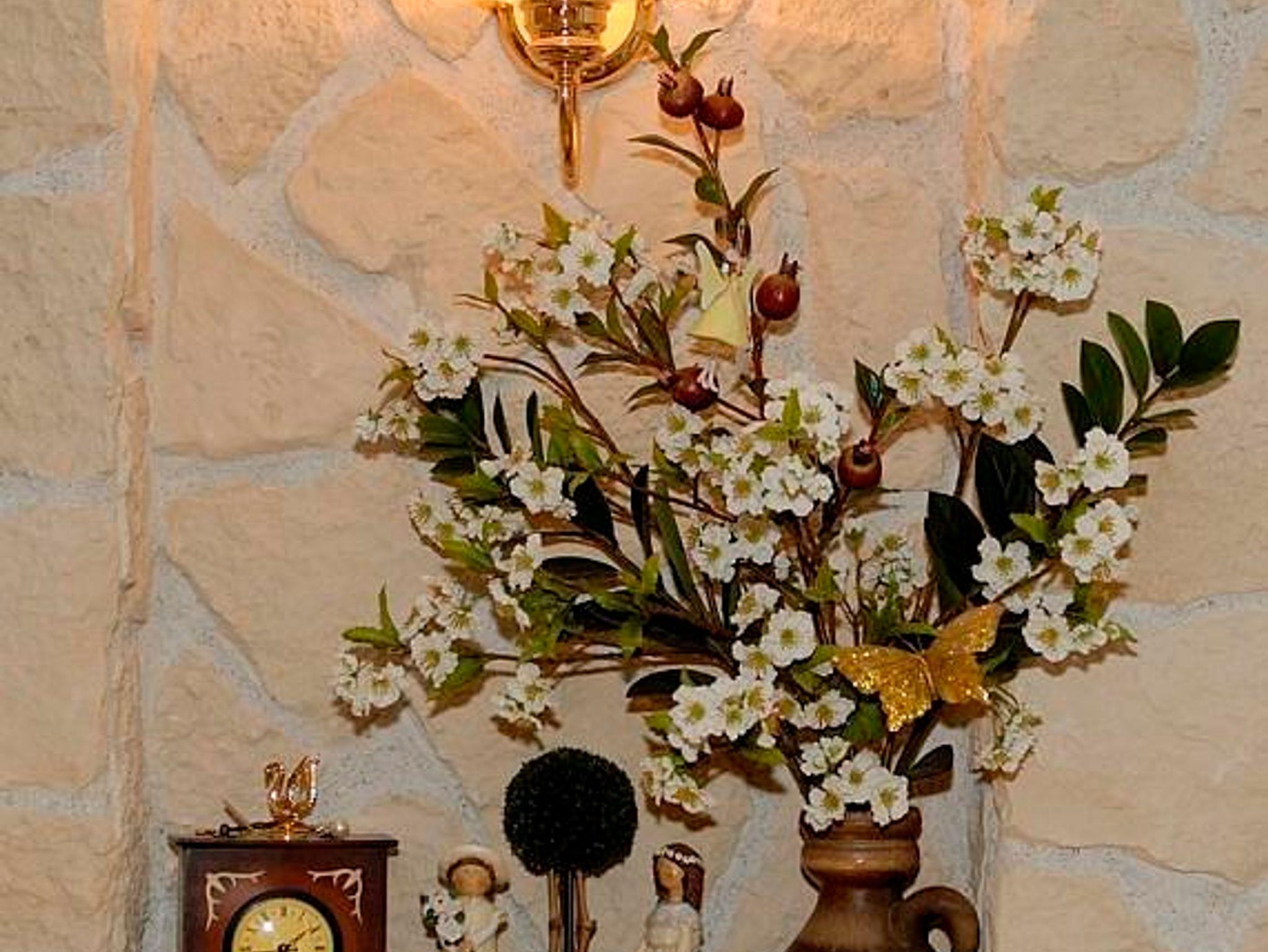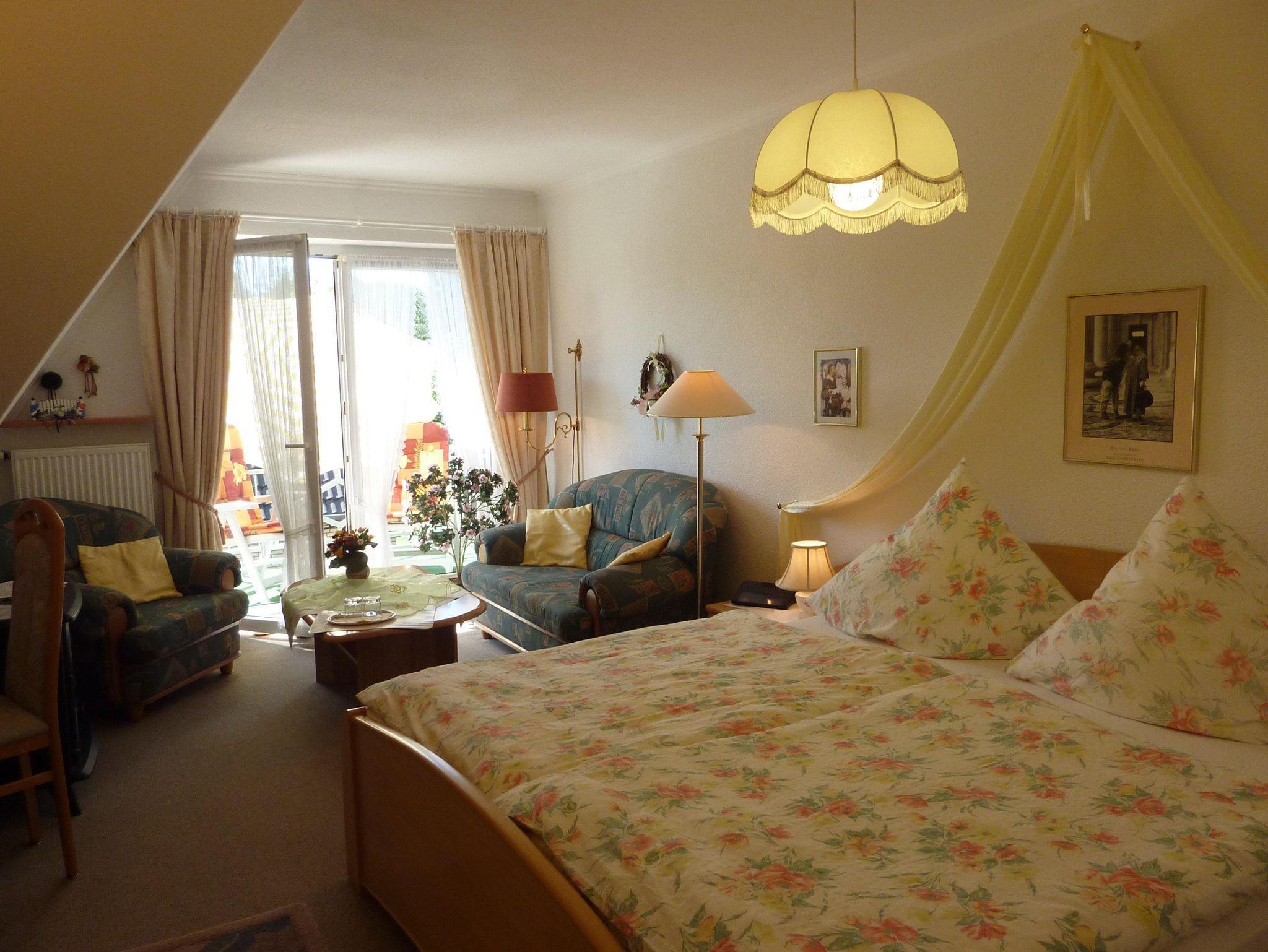 Romantisch eingerichtetes Komfort-Doppelzimmer mit elektrischem Kaminfeuer, DU/WC und Balkon.