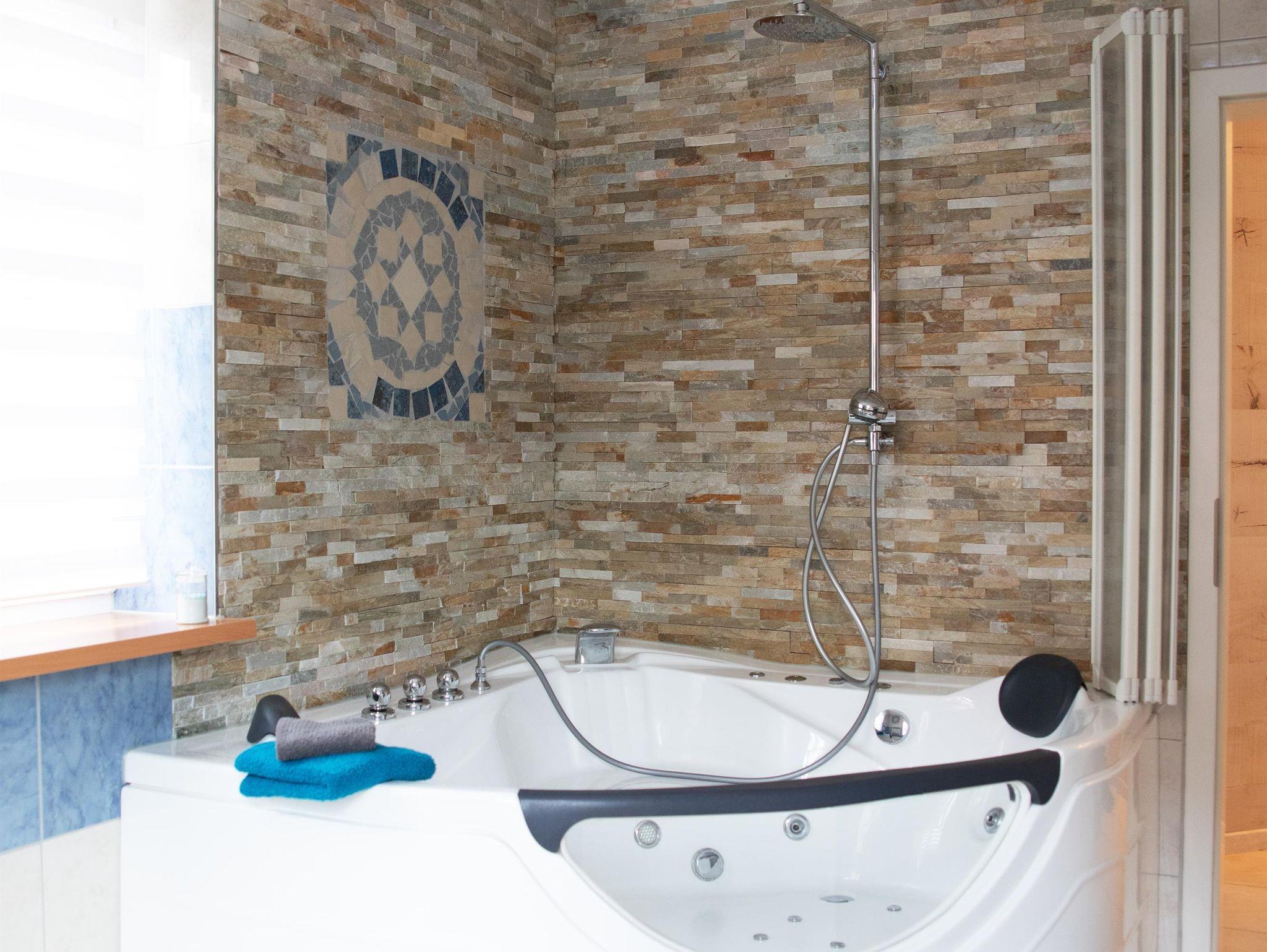 Die hell und gemütlich eingerichtete Ferienwohnung befindet sich im Erdgeschoss eines Einfamilienhauses. Sie verfügt über eine komplett eingerichtete Wohnküche mit Side by Side Kühlschrank, Eiswürfelspender und Kaffeevollautomaten sowie ein Esszimmer, eine Wohnzimmergarnitur und einen offenen Kamin und ein Schlafzimmer mit einem Doppelbett. Das große Bad ist mit einer Badewanne mit Whirlpool und integrierter Dusche, einem Waschtisch, einem Handtuchwärmer und einer Infrarotsauna ausgestattet. Das separate WC befindet sich direkt neben dem Bad. Die Ferienwohnung wird durch eine Fußbodenheizung beheizt.