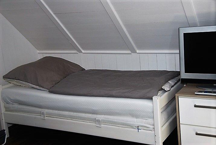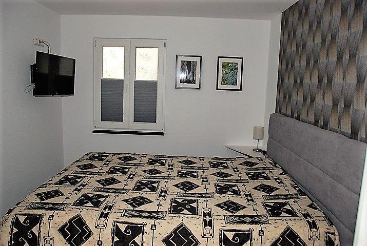 Im Erdgeschoss des Hauses befinden sich außerdem ein Schlafzimmer, dass mit einem bequemen Doppelbett (mit durchgehenden Matratzen) , TV-Gerät und viel Stauraum für Ihre Kleidung möbliert ist und ein Badezimmer mit Dusche, Waschtisch und WC.
